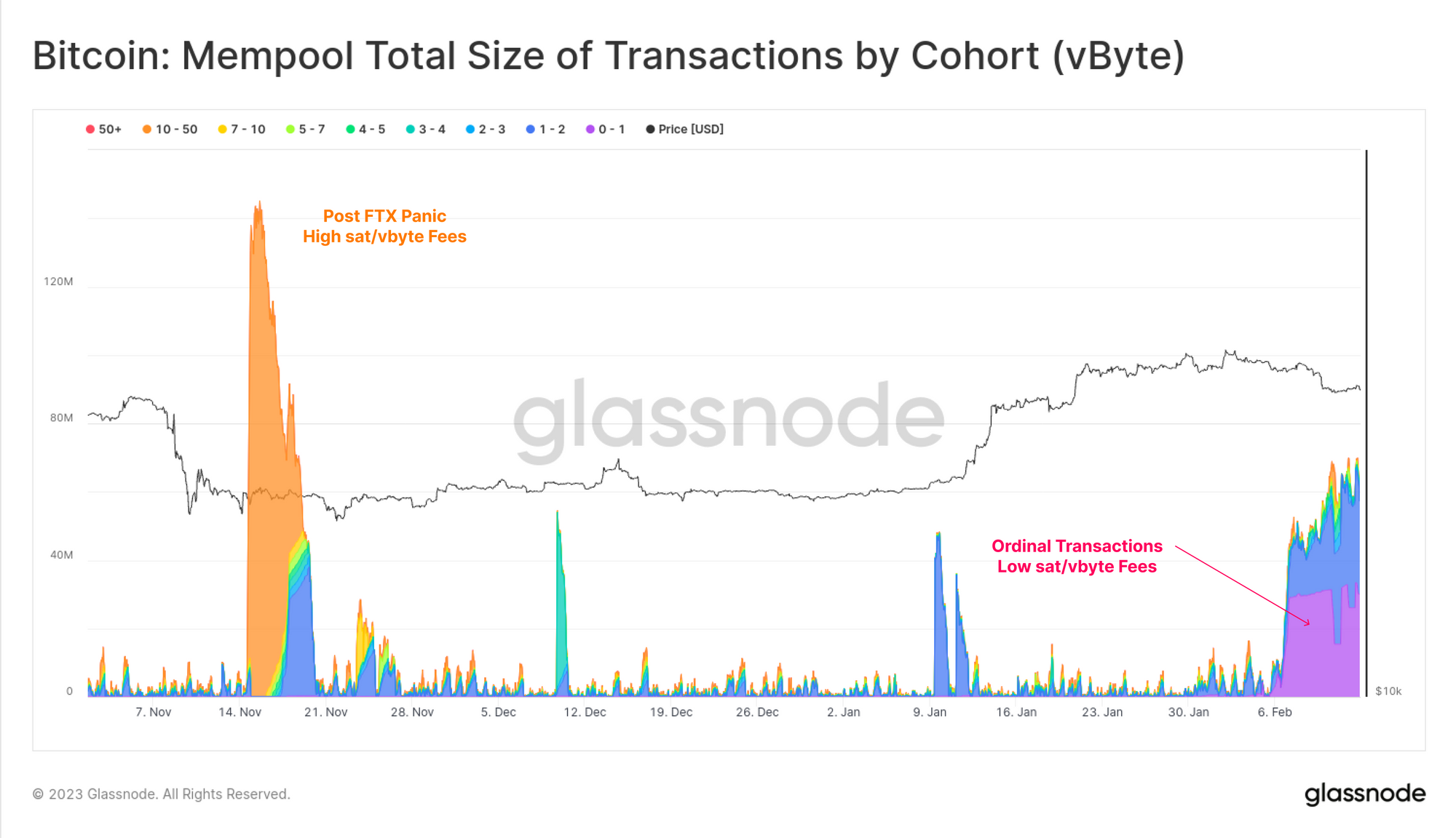 These larger blocks have stirred healthy discussions concerning the possible long-term effect of Ordinals on the Bitcoin blockchain size, initial node sync times, mempool congestion, and the state of the long-term fee market.The effect of Ordinals so far has been the setting a new lower bound transaction fee required for block inclusion. A large influx of low fee paying transactions (0 to 1sat/vbyte) can be seen hitting our mempool in purple 🟣. This differs to the post FTX panic where the mempool was filled with high urgency, high fee paying transactions shown in orange 🟠.