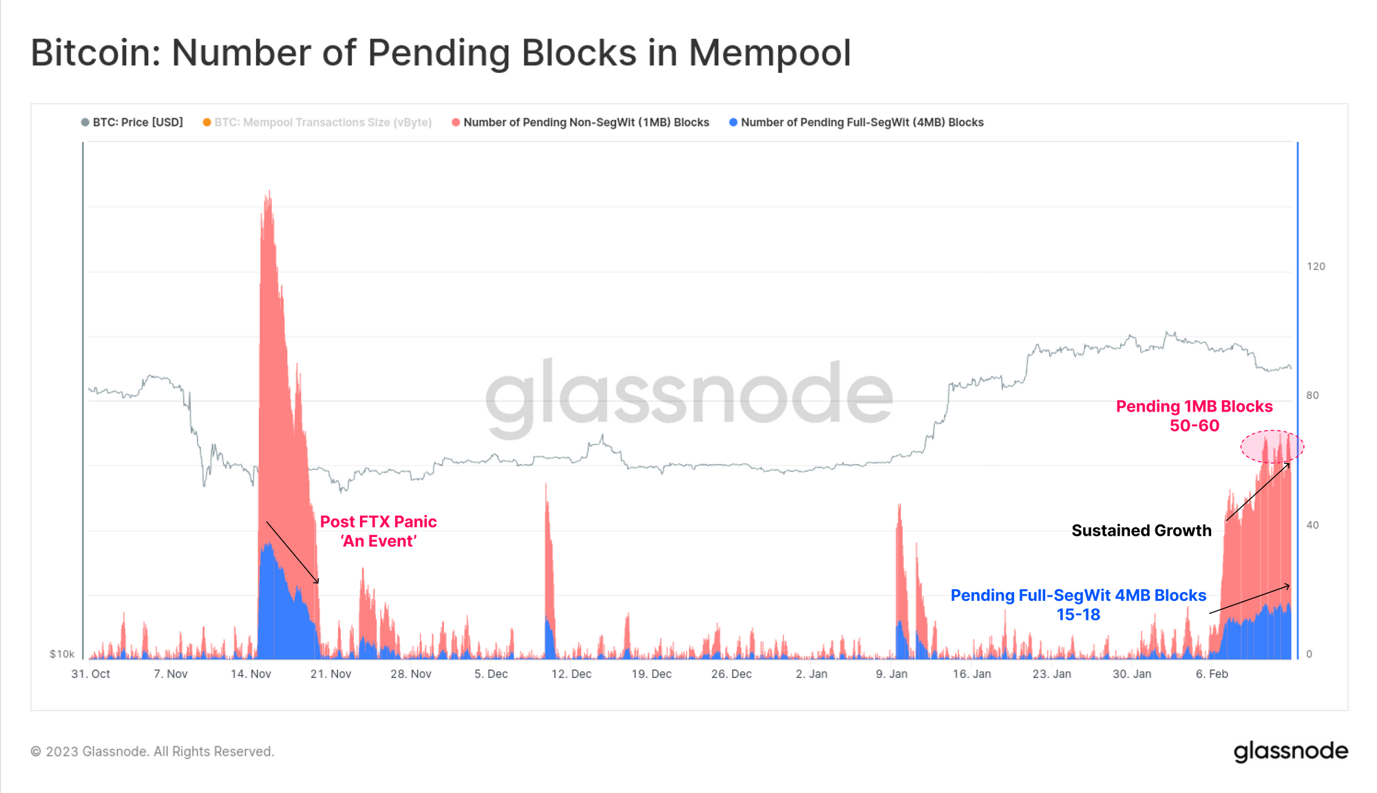 We can also model out the number of pending blocks required to clear the mempool assuming standard 1MB non-SegWit transactions 🔴, and full Seg-Wit 4MB blocks 🔵. We can again notice a significant difference to the post-FTX period which decayed quickly as the panic settled. With the Ordinals trend, we can actually see gradually growing demand for blockspace, having been maintained over the past week.