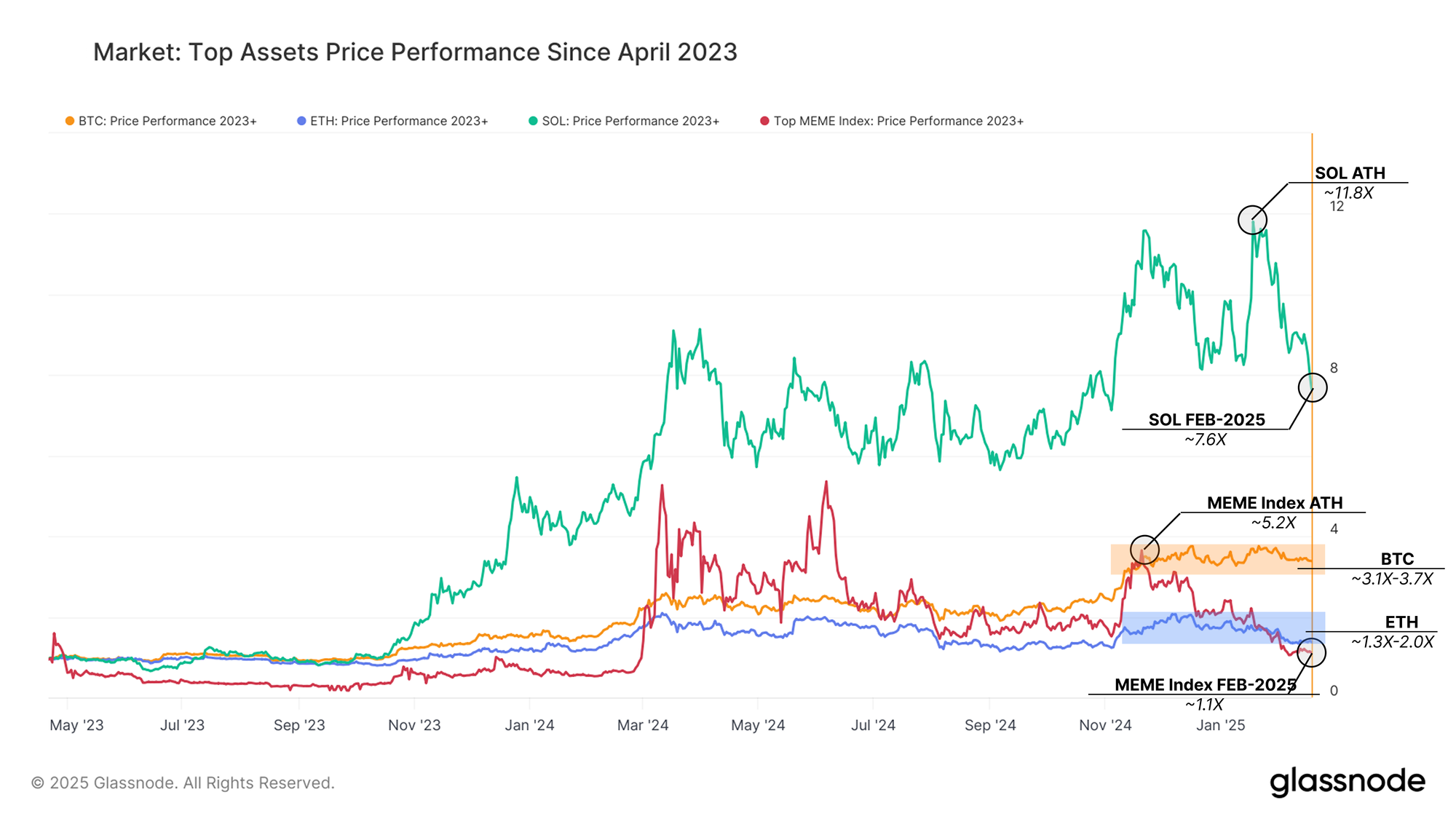 - Meme Coins Index: +90.2% (Dec 2024) → -37.4% (Feb 2025)