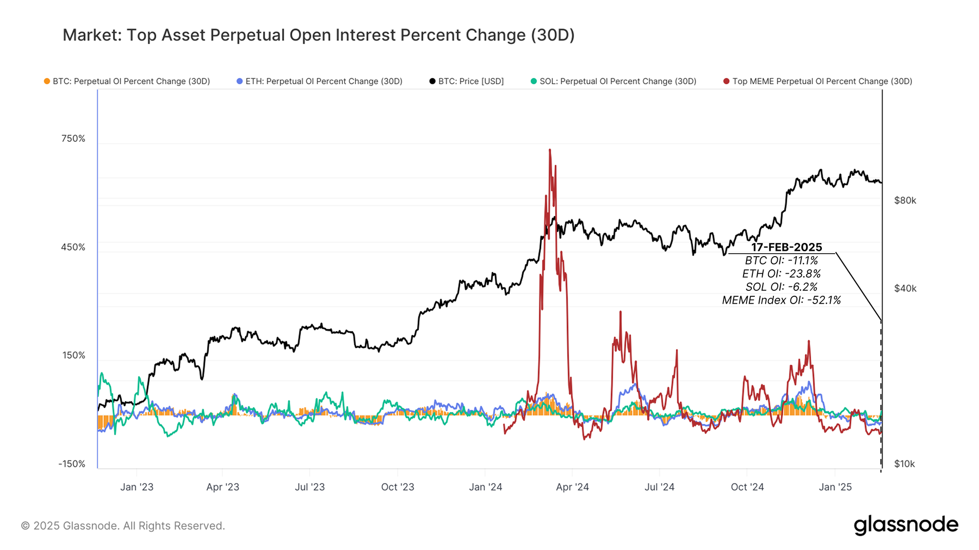 - Perpetual futures open interest has declined across Bitcoin (-11.1%), Ethereum (-23.8%), Solana (-6.2%), and Memecoins Index (-52.1%), reflecting a diminished appetite for leveraged speculation.