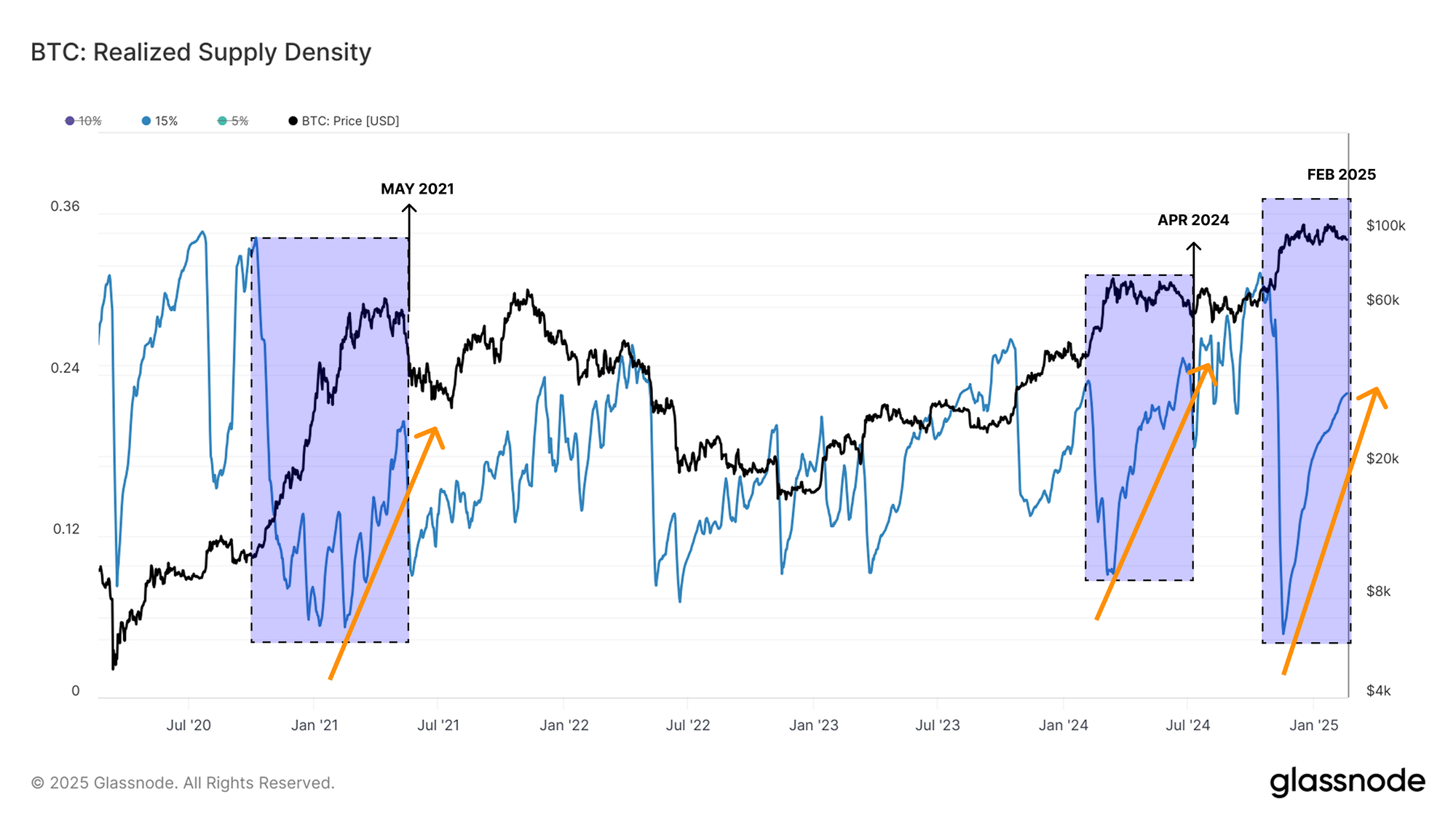 In prior instances where Bitcoin has reached a new ATH, we observe a consistent post-rally pattern, where a surge in realized supply density occurs within ±15% of the spot price. This results from the market transitioning from an aggressive uptrend into price consolidation, as the market trades within a relatively narrow range.
