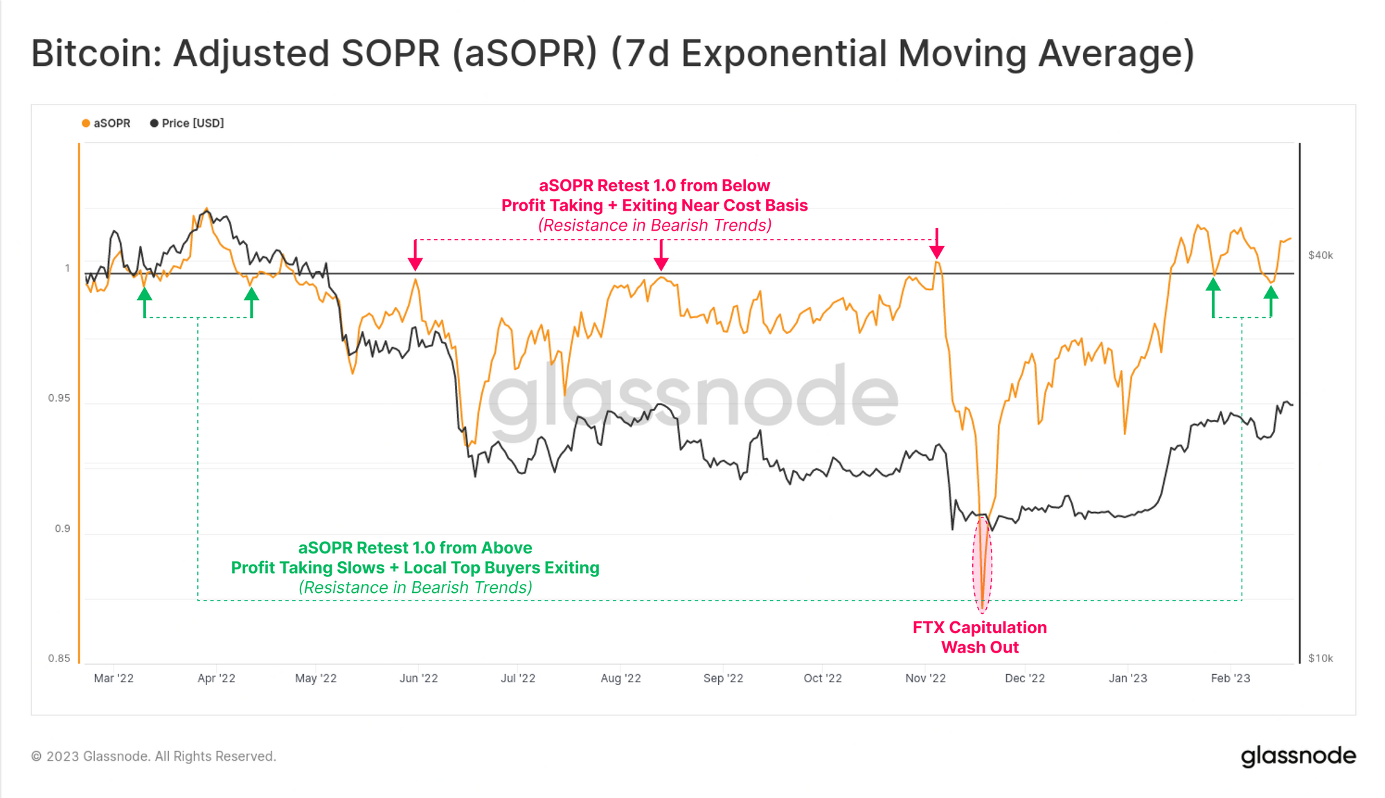 We can see this profit-taking behavior in several SOPR variants, which find a degree of support on the neutral value of 1.0. An aSOPR retest of 1.0 during a bullish impulse indicates that profit-taking is slowing (which would otherwise be upwards pressure on the metric), and holders of coins at a loss are also slowing their spending (otherwise downward pressure).