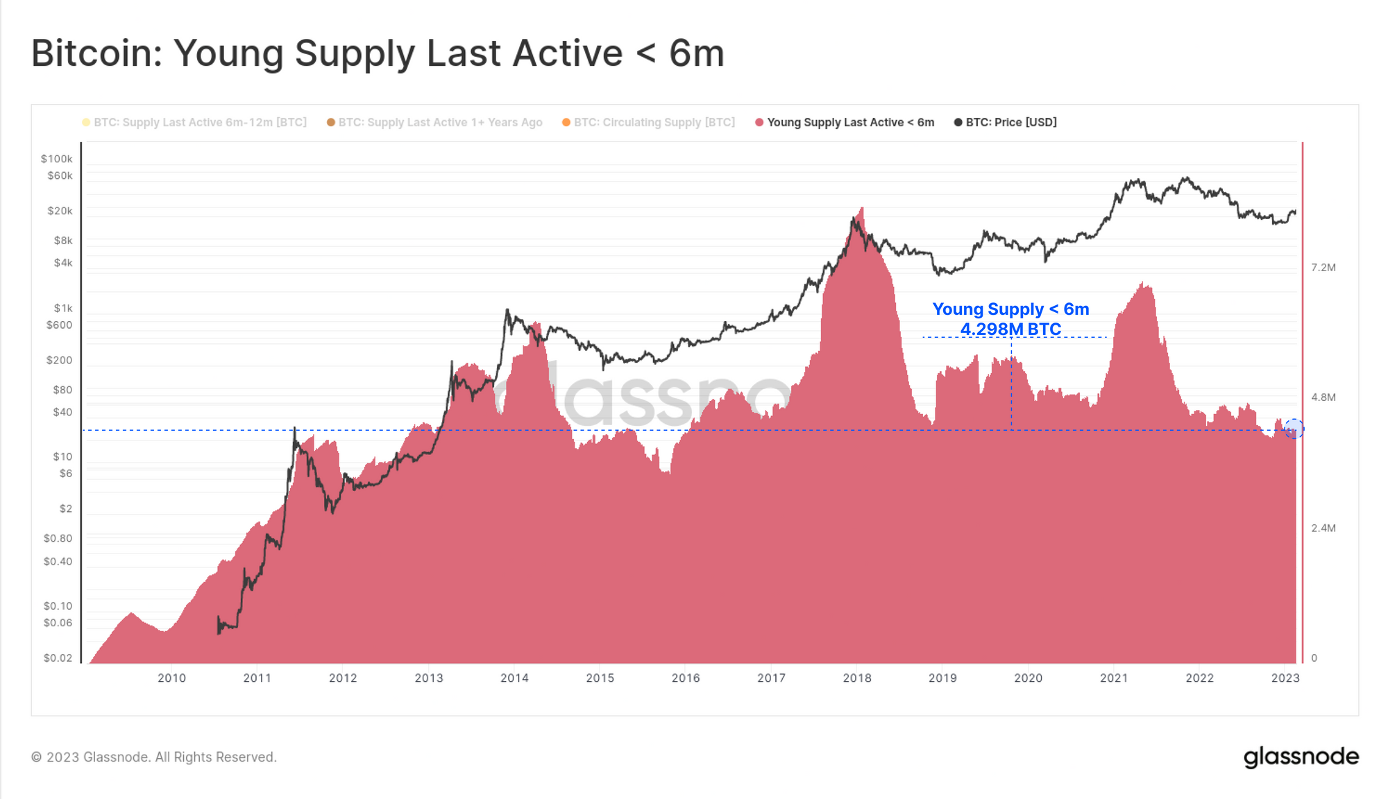 The total supply younger than 6-months has not increased significantly year-to-date, hovering around 4.298M BTC. Since this is a binary system (older/younger than 6m), this broadly indicates that coins older than 6-months are, in the aggregate, extremely dormant at present.