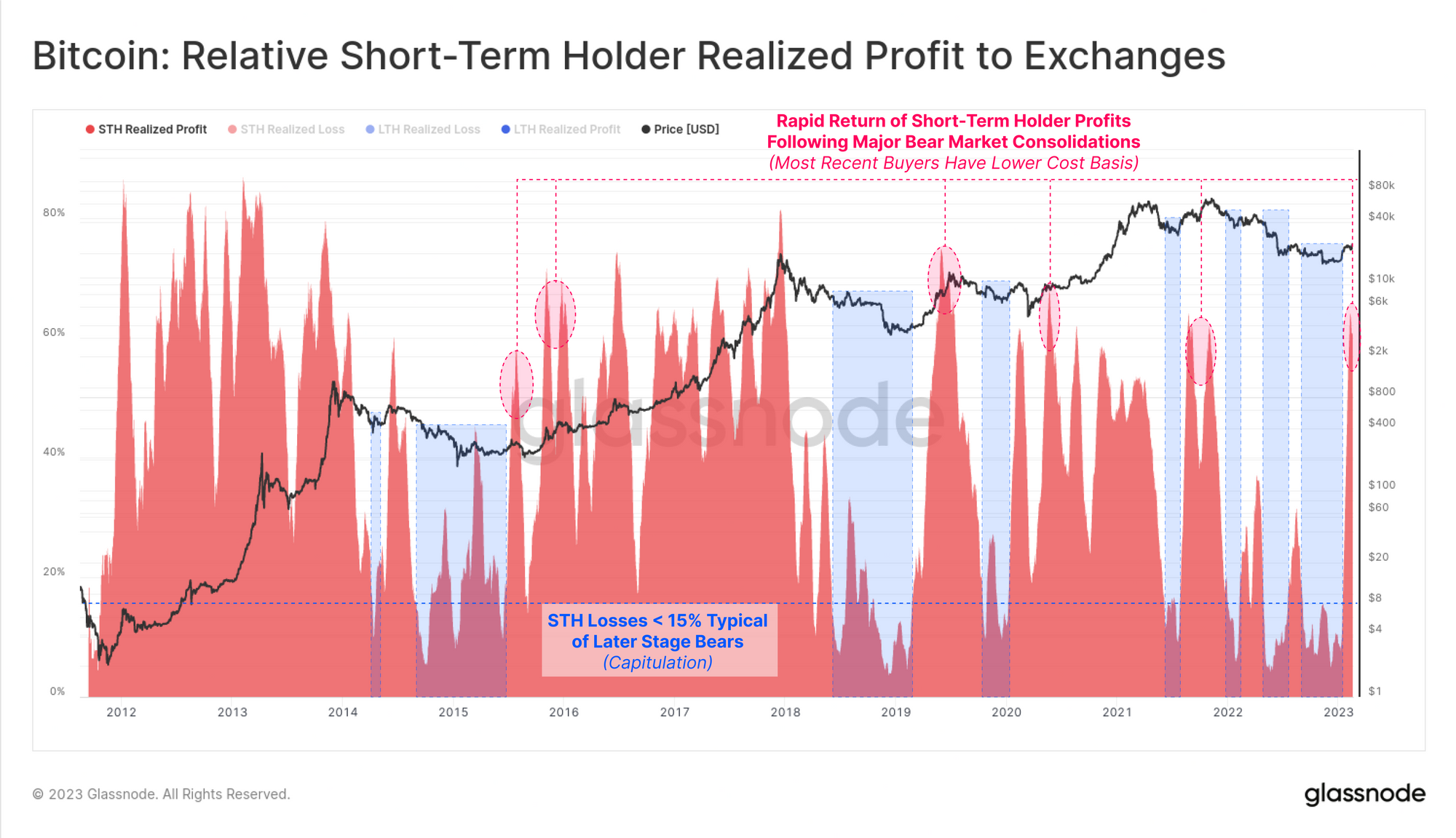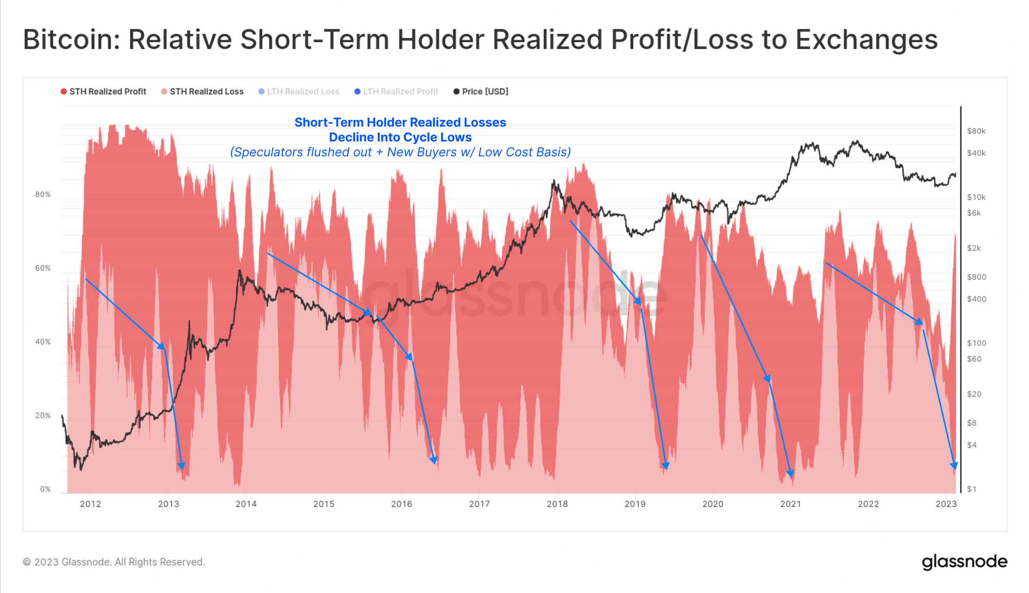 The chart below shows the relative share of realized profit and loss locked in by the STH cohort, filtered specifically for coins sent to exchanges to best simulate sell-side forces. We can see a decay pattern in relative STH losses towards market cycle lows, as last-gasp speculators are flushed out, and coins transfer to bottom-building buyers, now with a lower cost basis.