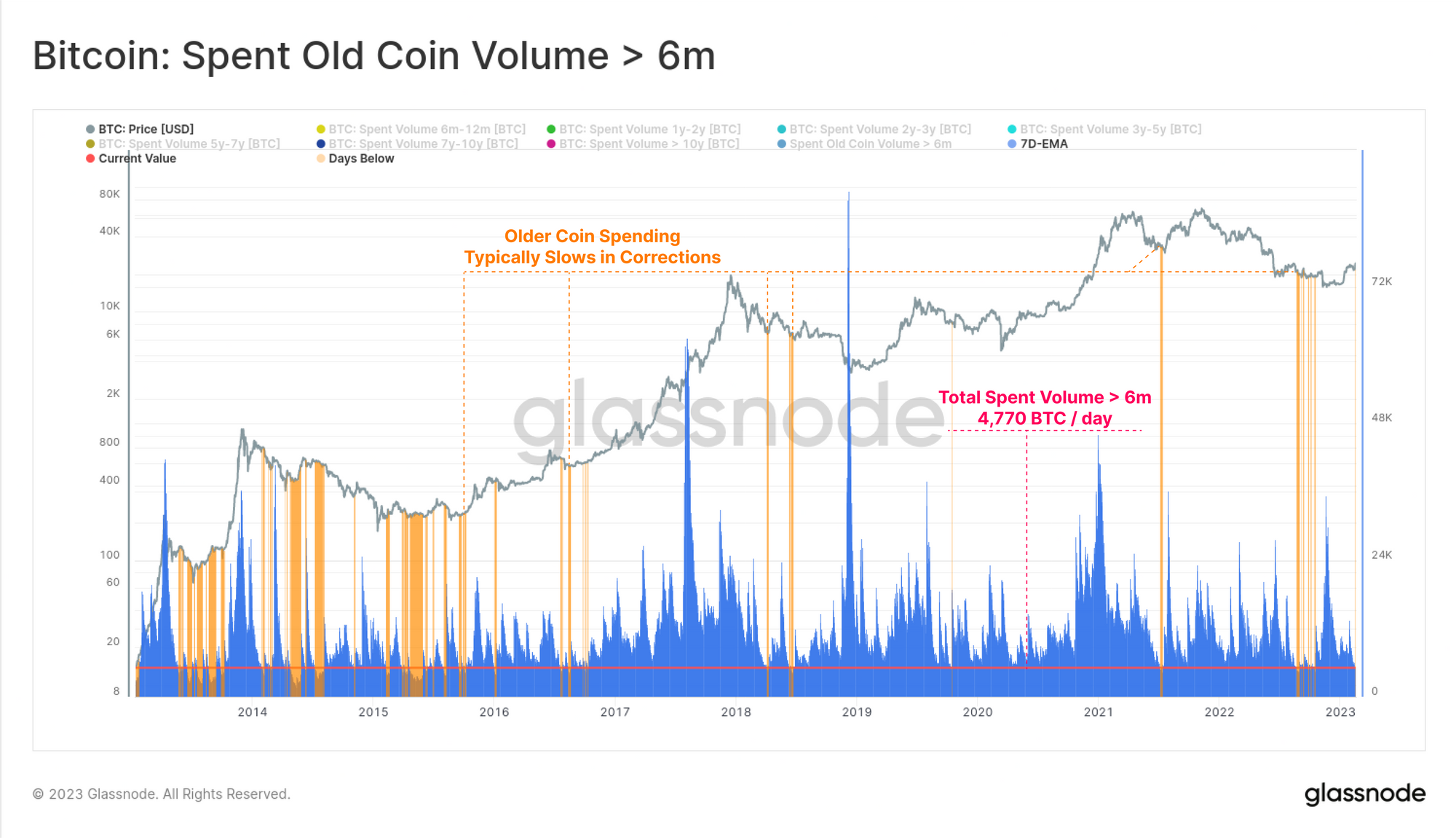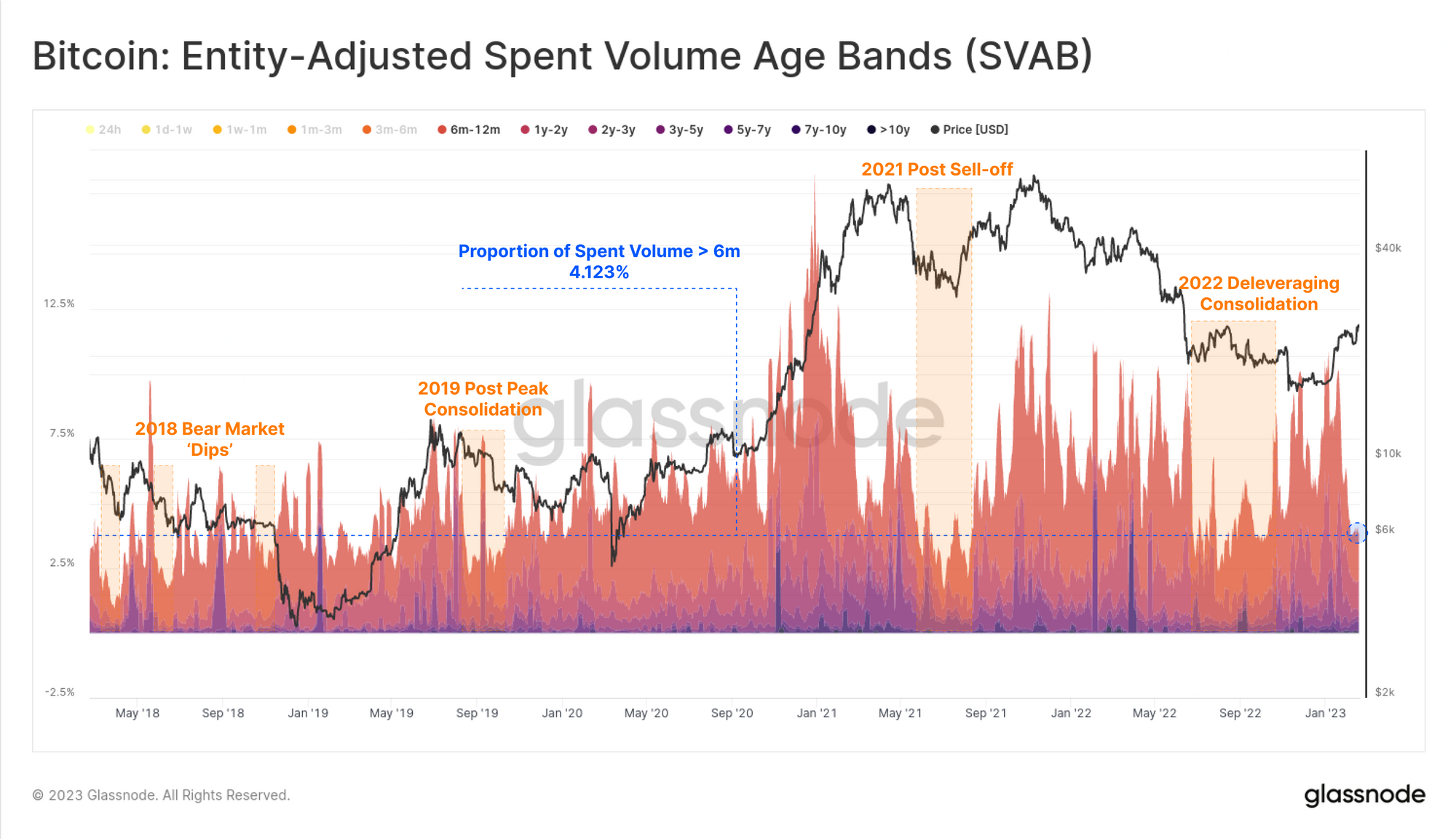 In a newly released Entity-Adjusted variant of the SVAB metric, we can see that just 4.123% of all spent volume is older than 6-months. Key periods where older hands have displayed a similarly subdued tendency for spending are during bear market declines throughout 2018 to 2022.