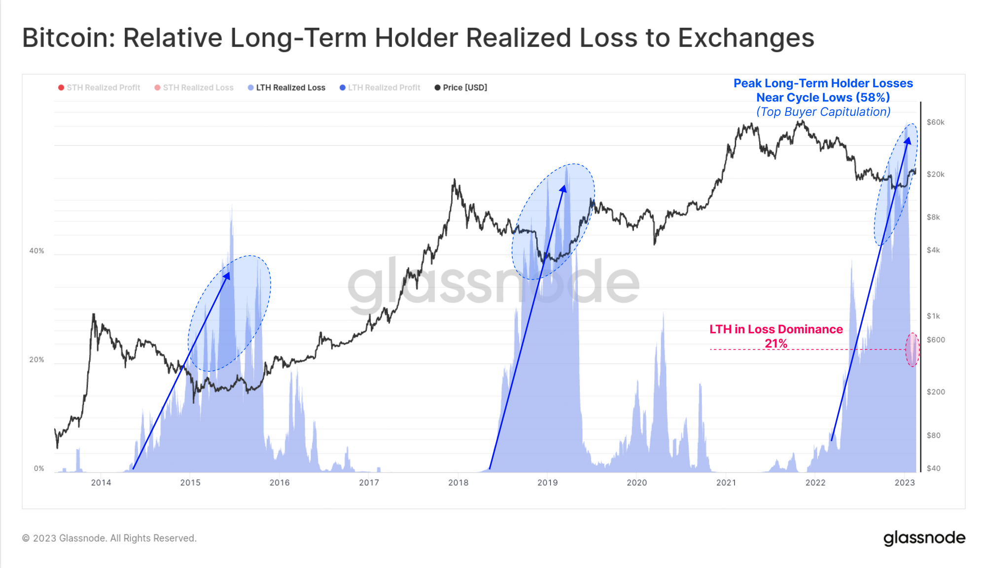Of all realized value on coins sent to exchanges, LTHs in loss have declined dramatically from a cycle peak of 58% in mid-Jan, to 21% today. Similar sharp declines in the metric can be seen in each prior cycle as LTHs find the necessary hope to HODL, once again.