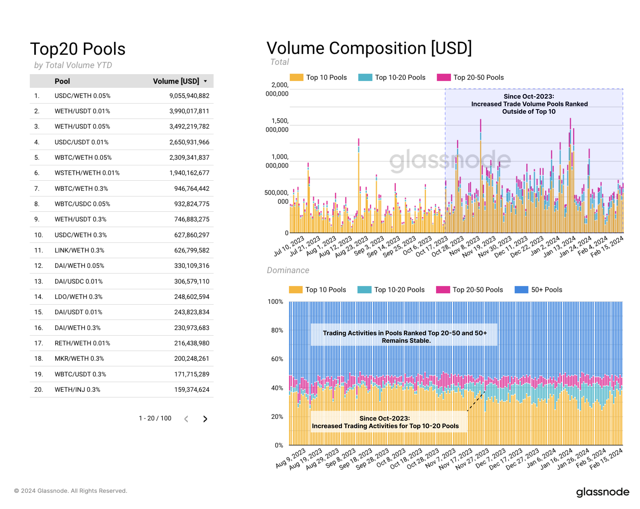A resurgence in Altcoin trading on Uniswap, alongside liquidity and trading volume patterns, underscores a cautious yet growing interest in longer-tail assets. This is initially showing up in changing liquidity provision, and an expectation of heightened volatility. This however is particularly present TVL within the pools, and investor trade volume has yet to follow.