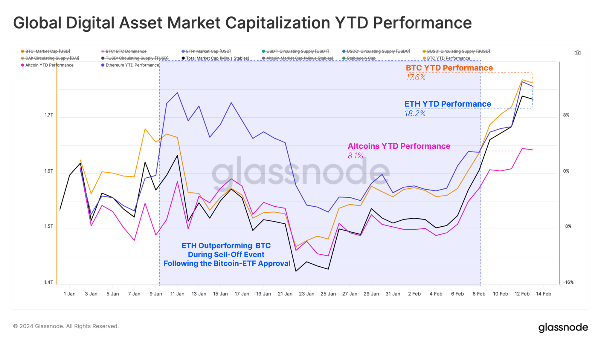 In terms of asset performance, BTC and ETH are leading the pack, with YTD gains of +17.6% and +18.2%, respectively. We note that following the approval of the Bitcoin ETF, ETH has started to outperform BTC, which is a change from the relative underperformance throughout 2023.