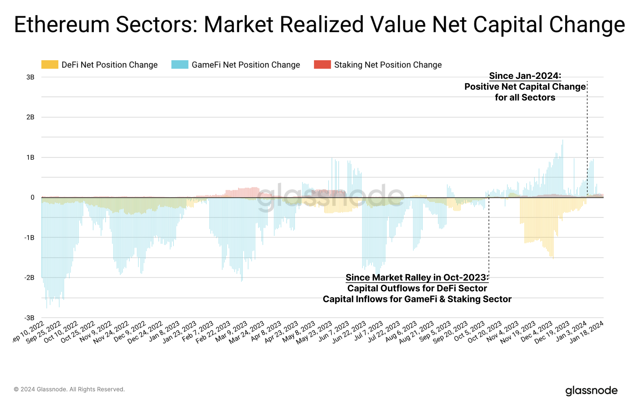 Within the Ethereum ecosystem, we can specify three major sectors: DeFi, GameFi, and Staking. Since the beginning of this year, all three sectors have seen inflows, however the DeFi and GameFi sectors have seen relatively large capital outflows throughout 2022 and 2023.