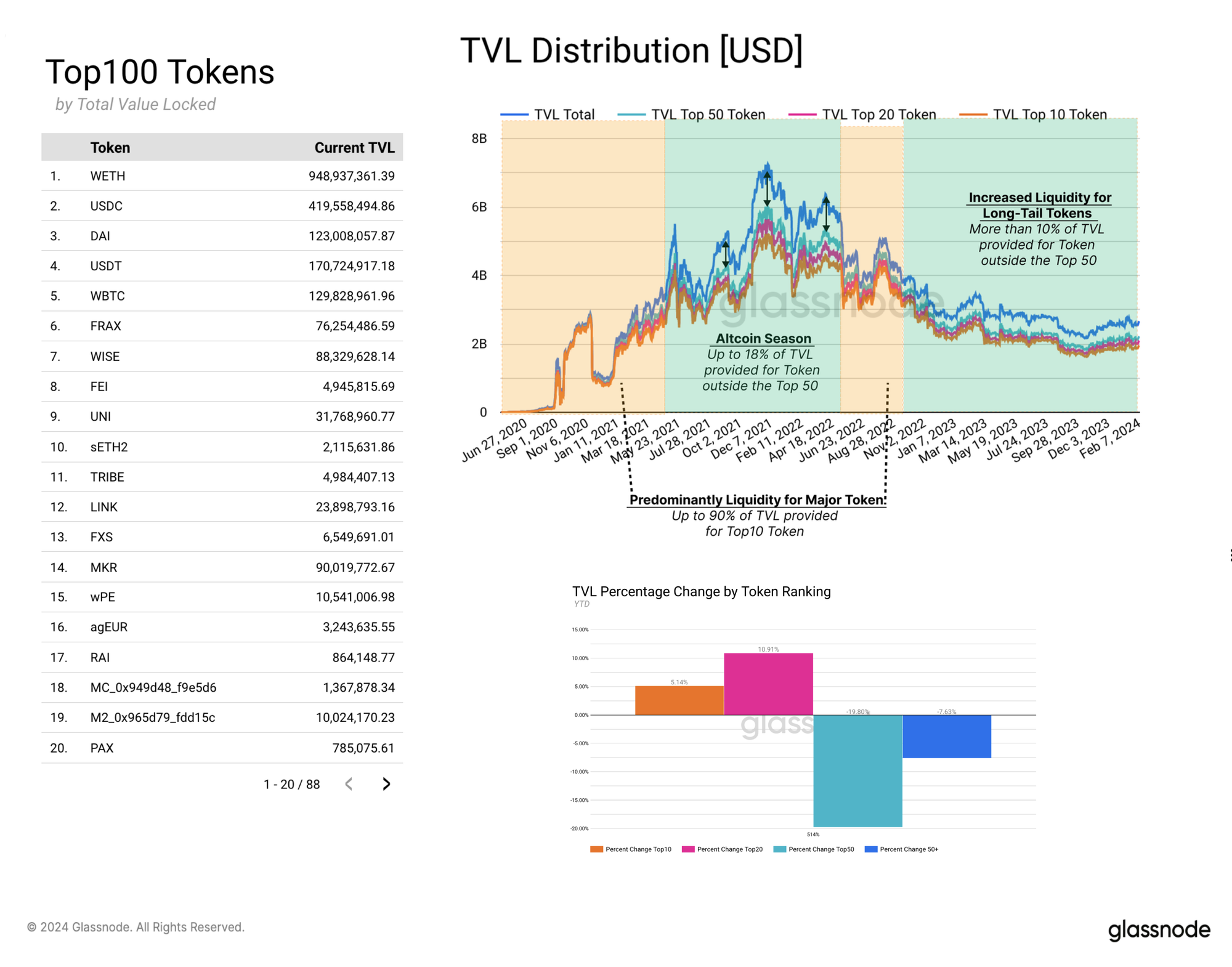 Liquidity Providers on Uniswap tend to closely monitor the markets, and changes in the distribution of liquidity across pools can provide an indication for prevailing market trends. By examining the composition of the Total Value Locked (TVL) on Uniswap, we observe that during Altcoin Season, there is increased liquidity profile for tokens outside the Top 50. This trend is indicative of growing investor interest in long-tail tokens.