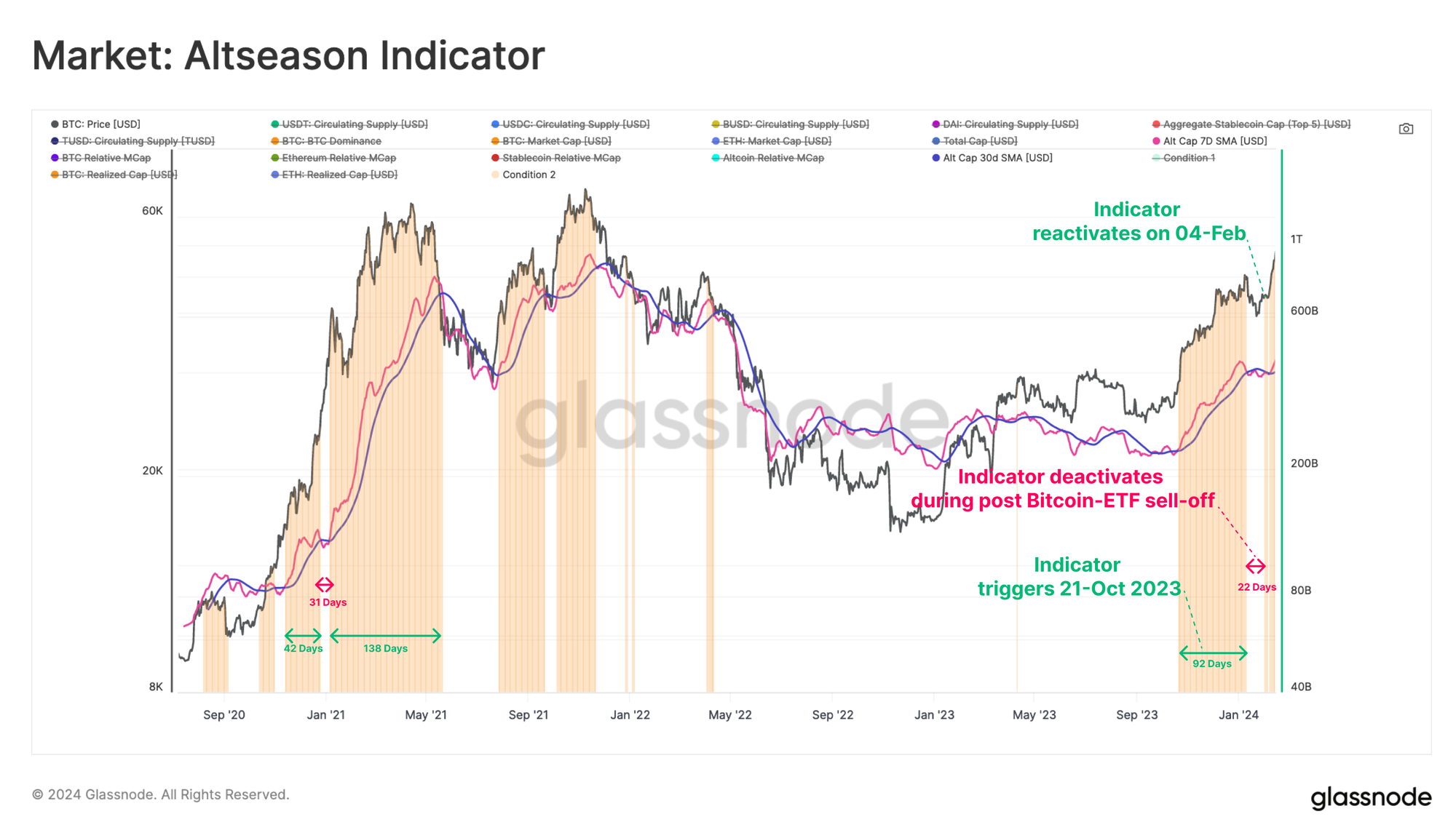 Our Altcoin Indicator has signalled positive momentum since October last year, with a brief pause during the sell-the-news event after the Bitcoin-ETFs went live. It re-triggered on the 4-Feb.