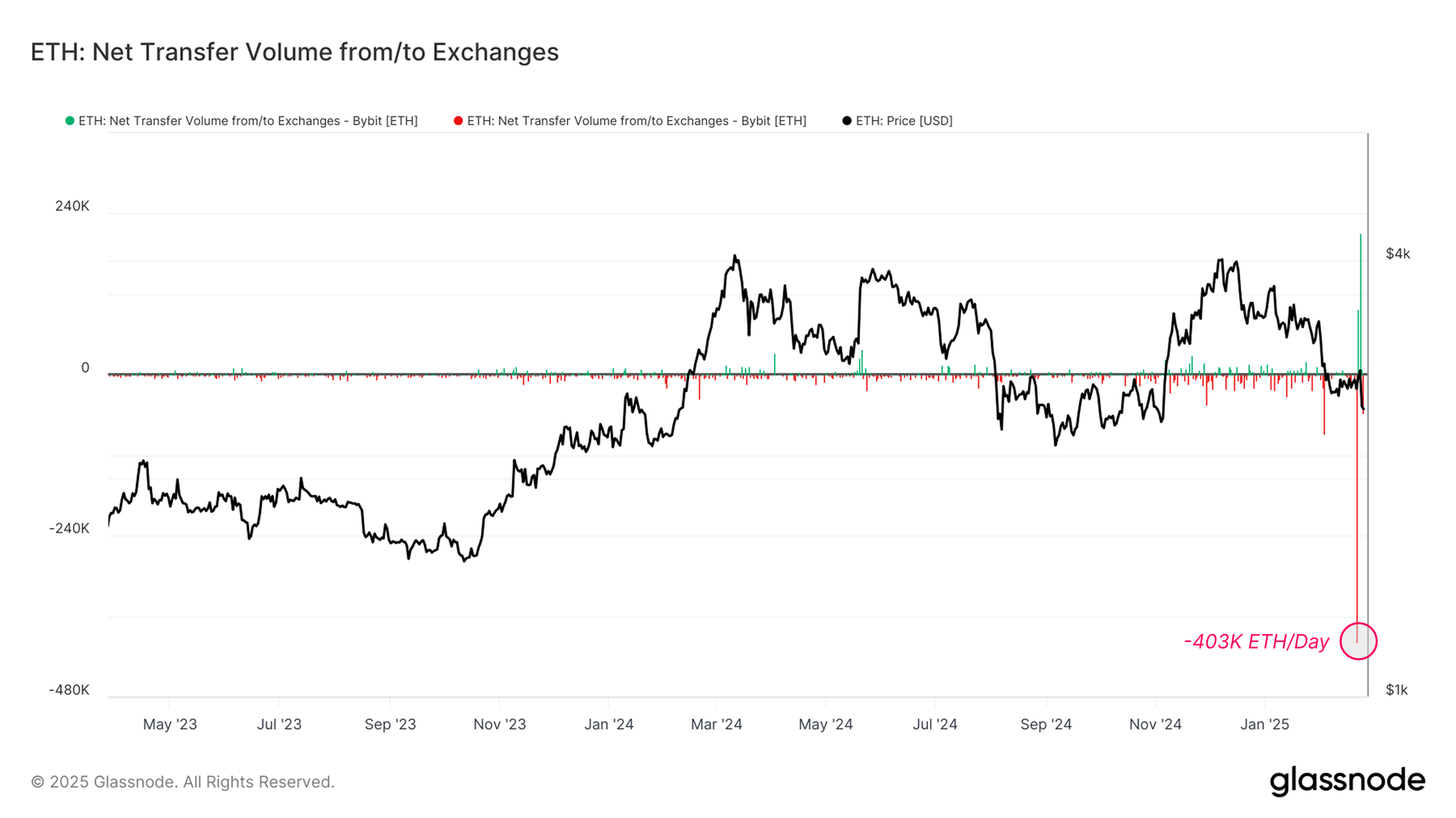 - Bybit suffered one of the largest hacks in crypto history, losing 403,996 ETH (~$1.13B) from its cold wallets due to a smart contract exploit. This breach led to panic withdrawals, with total exchange outflows reaching approximately $4.3B across Bitcoin and stablecoins.