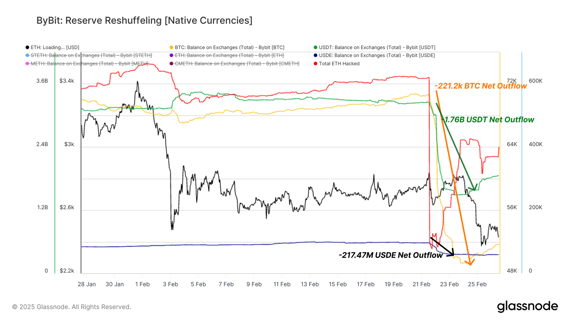 By February 24, 2025, Bybit’s BTC, USDT, and USDE reserves experienced substantial outflows: