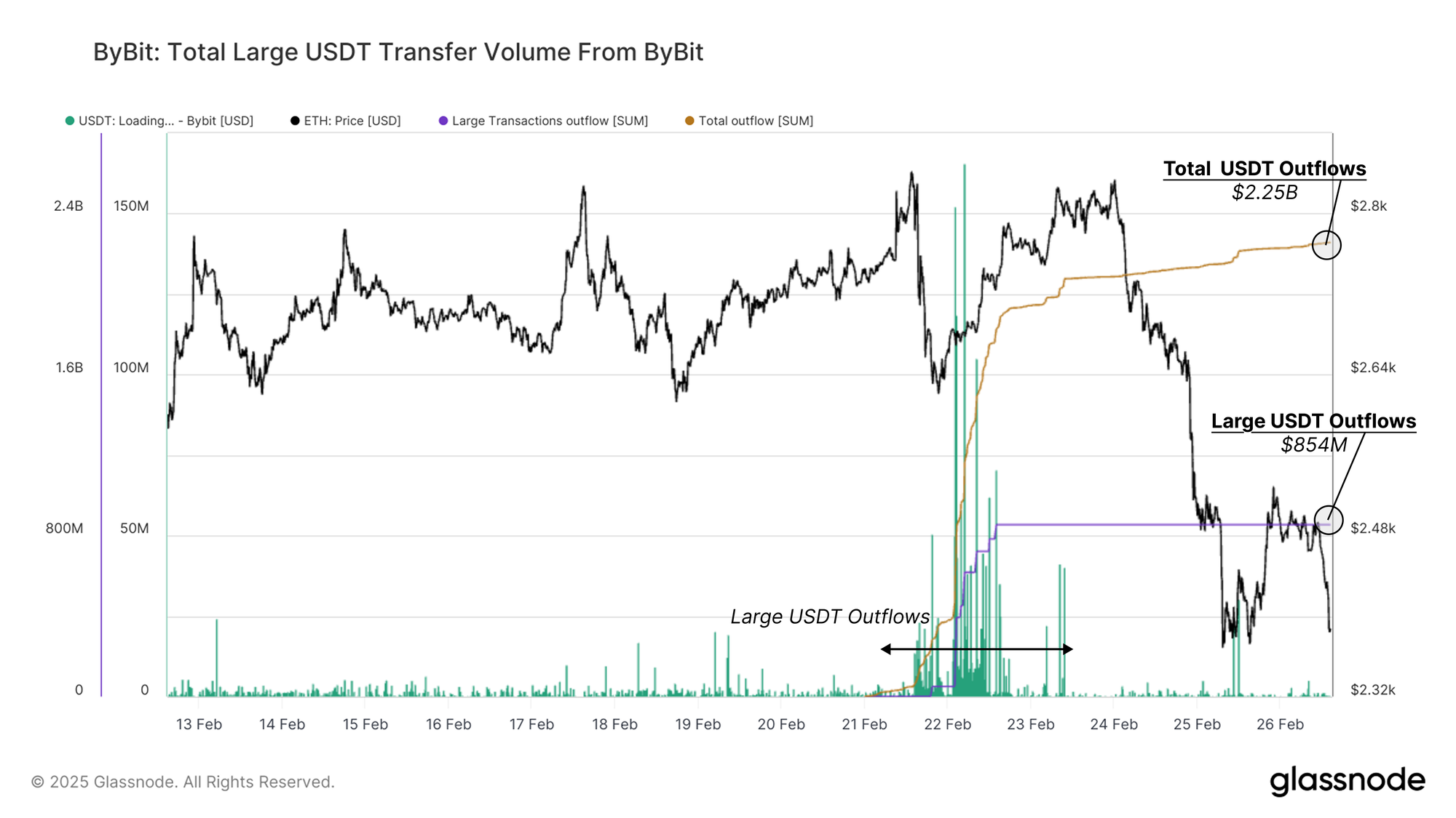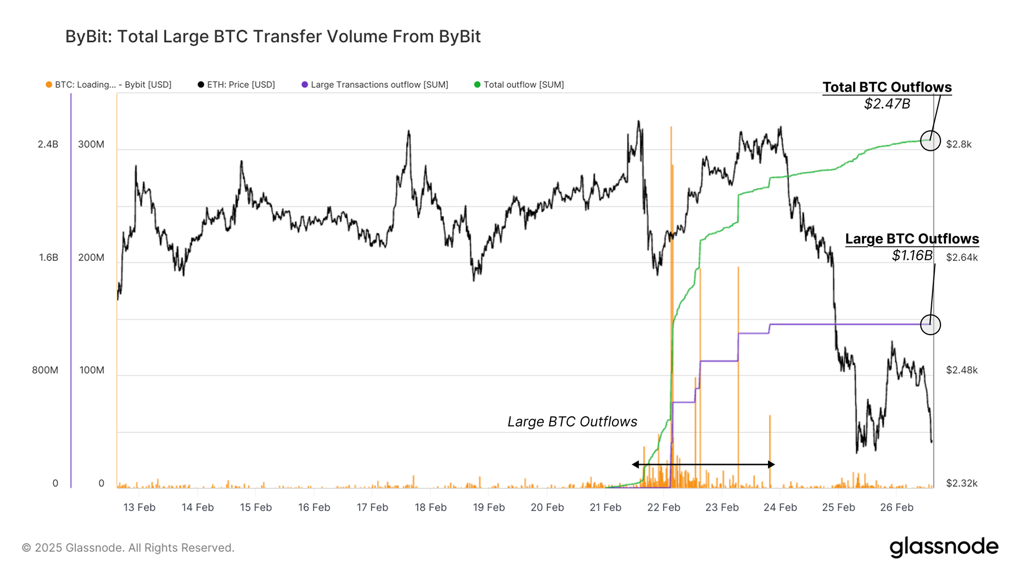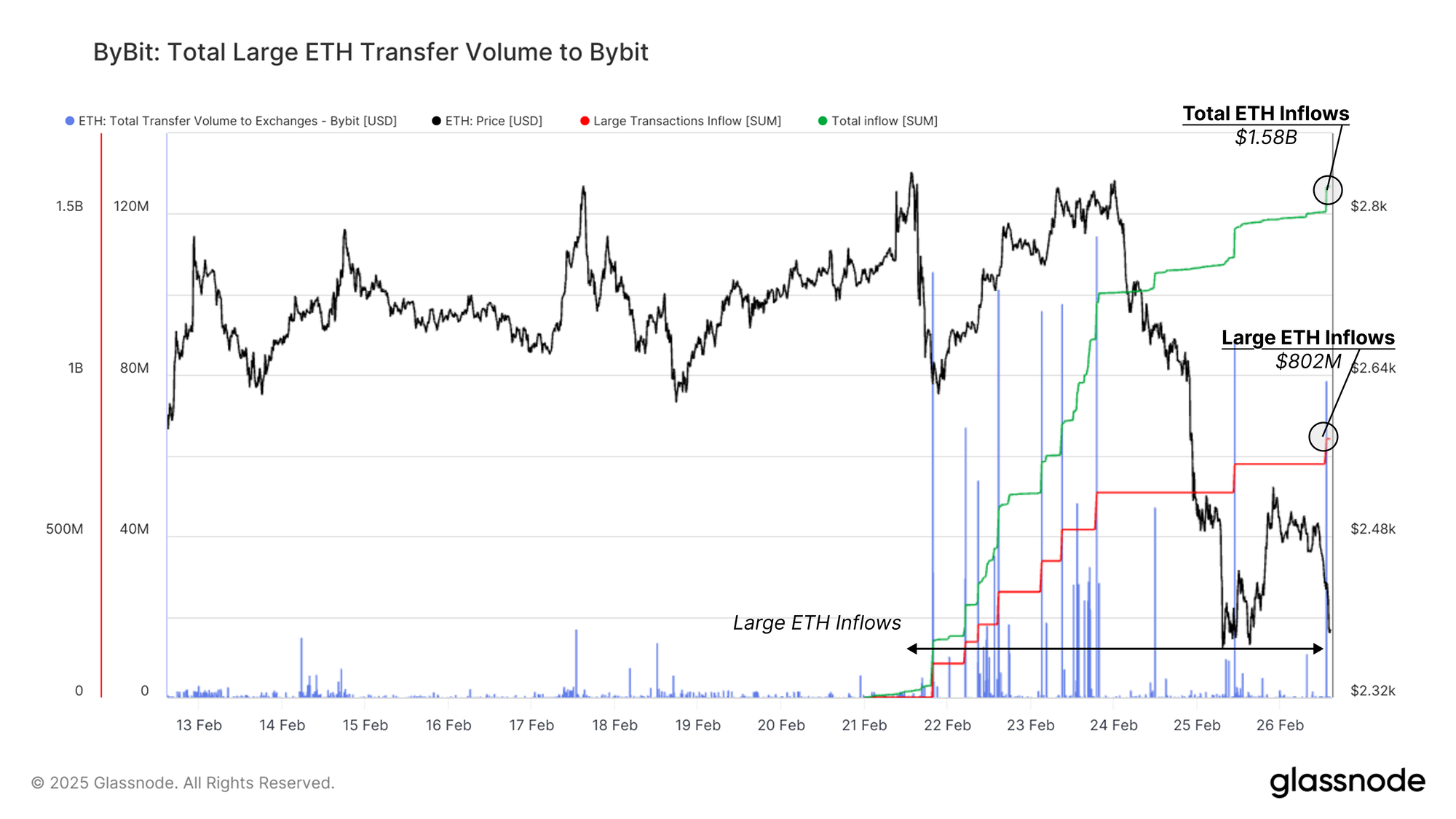 By February 26, 2025, Bybit received a total Ethereum inflow of $1.58B, with $802M (50.7%) originating from just eight large transactions.