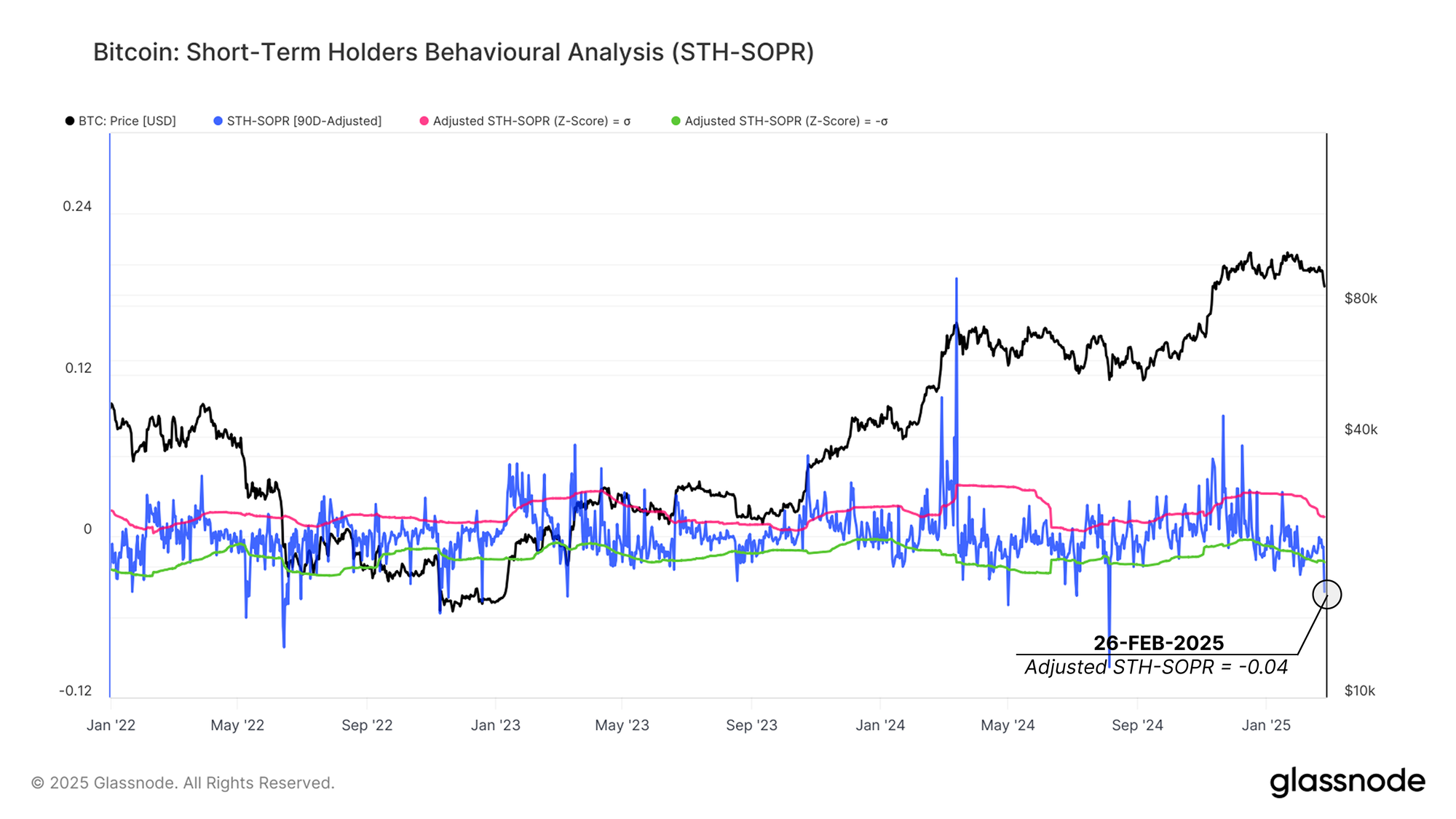 - STH-SOPR has dropped by -0.04 below its quarterly median, significantly under the one standard deviation threshold (-0.01).