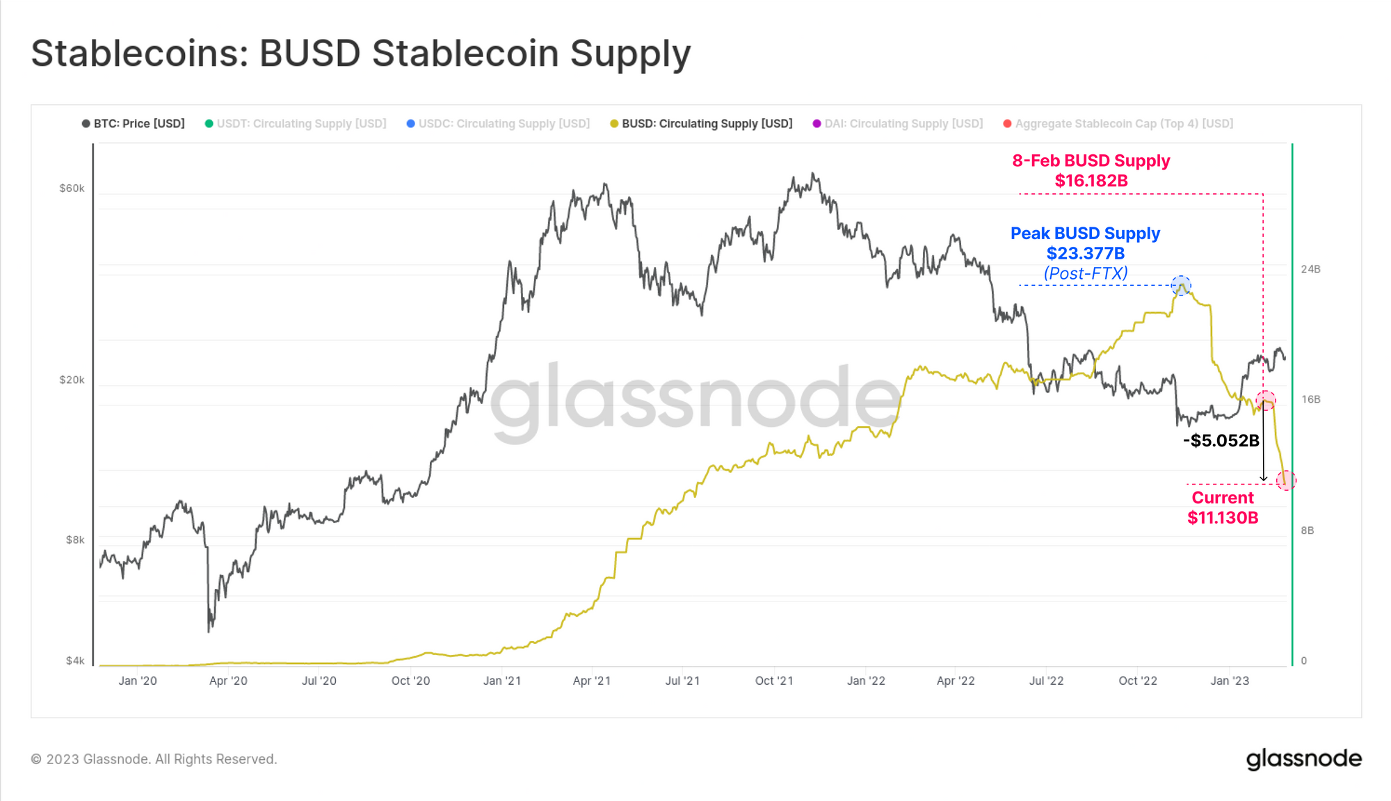 Shortly after, on 13-Feb, stablecoin issuer Paxos declared it would halt minting of BUSD on 21-Feb amid regulatory pressure coming from the New York State Department of Financial Services. BUSD holders responded quickly by migrating over to other stablecoins while having a clear preference for USDT. Since 8-Feb, BUSD has declined by more than 31.2%, seeing over $5.052B in redemptions.