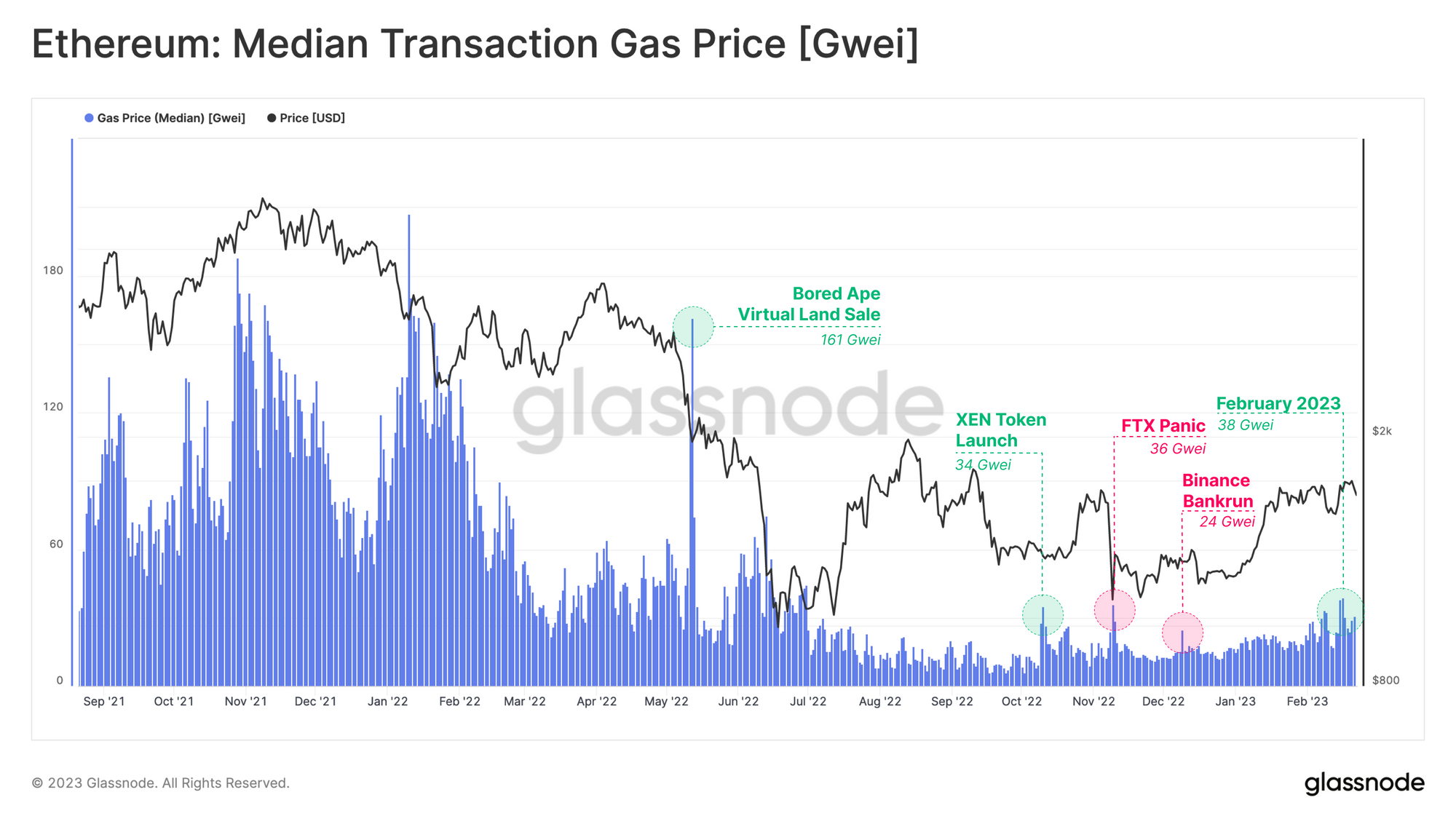 Median transaction gas prices have been consistently low over the past nine months, ranging between 10 to 20 Gwei. This translates to an average of $0.50 for a standard transaction and around $2.00 for a smart contract interaction, a fraction of the triple-digit numbers we saw during the past bull cycle. Low gas costs indicate low demand for blockspace and therefore little usage of Ethereum's applications, which is typical during bear markets.