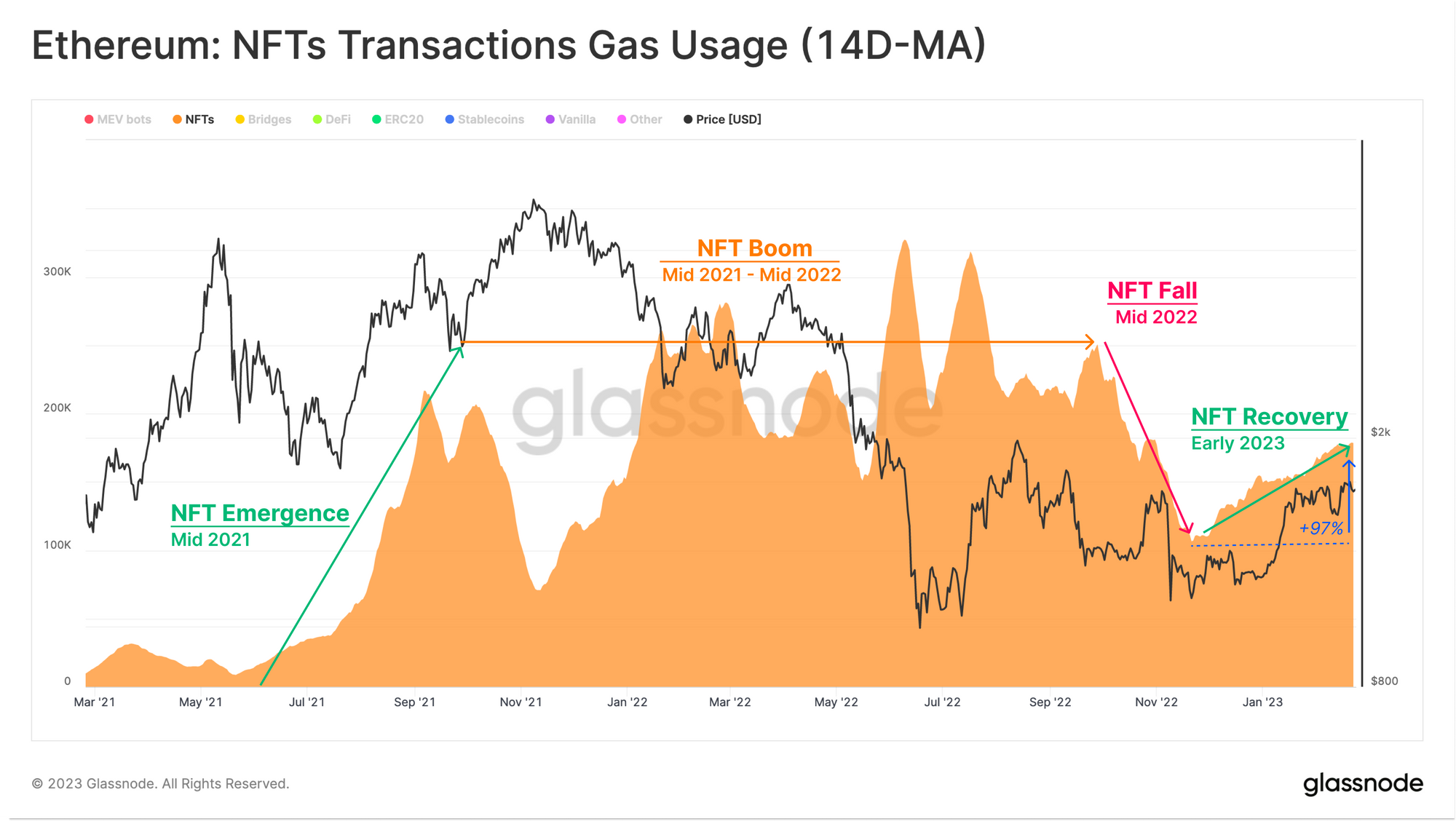Upon closer examination of the gas usage by transaction chart, we can determine that a primary source of this increasing network activity is the NFT market, which is once again showing signs of growth.