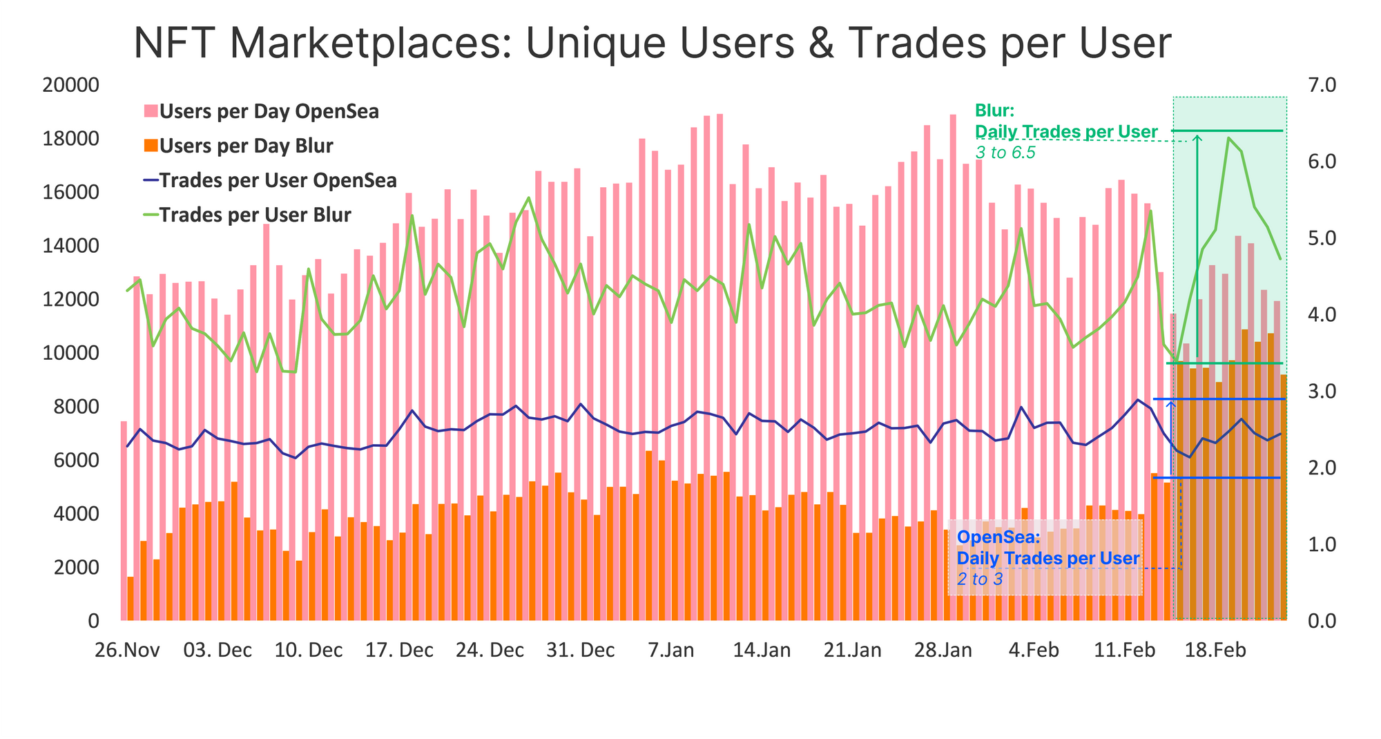 In that regard Blur is clearly leading the race with between 4 or 5 trades per user on a daily base, while OpenSea sees on average of two daily trades per user. A higher sales frequency can create a flywheel effect, since more NFT sellers feel confident listening on Blur’s platform, creating a larger offering, which in turn attracts more buyers.