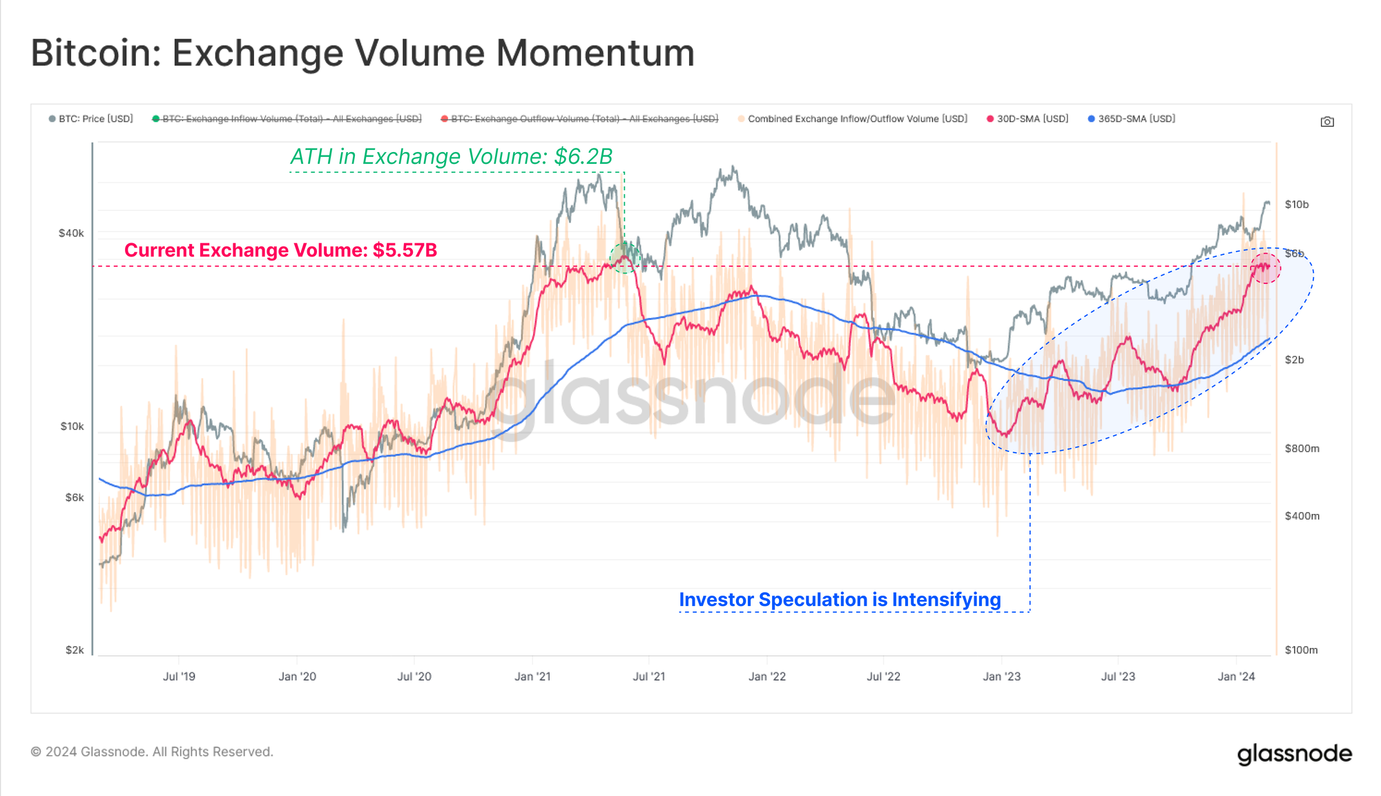 The total volume of deposits and withdrawals has continued to expand, reaching a staggering $5.57B in daily volume flowing in and out of exchanges, rivalling activity seen during the Nov 2022 market ATH.