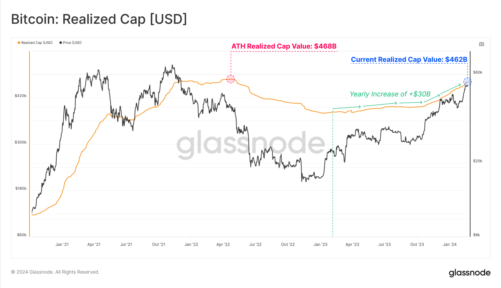 - Bitcoins recovery is near completion as capital continues to pour into the asset class, propelling the Realized Cap to $460B, and only 3% shy of its ATH.