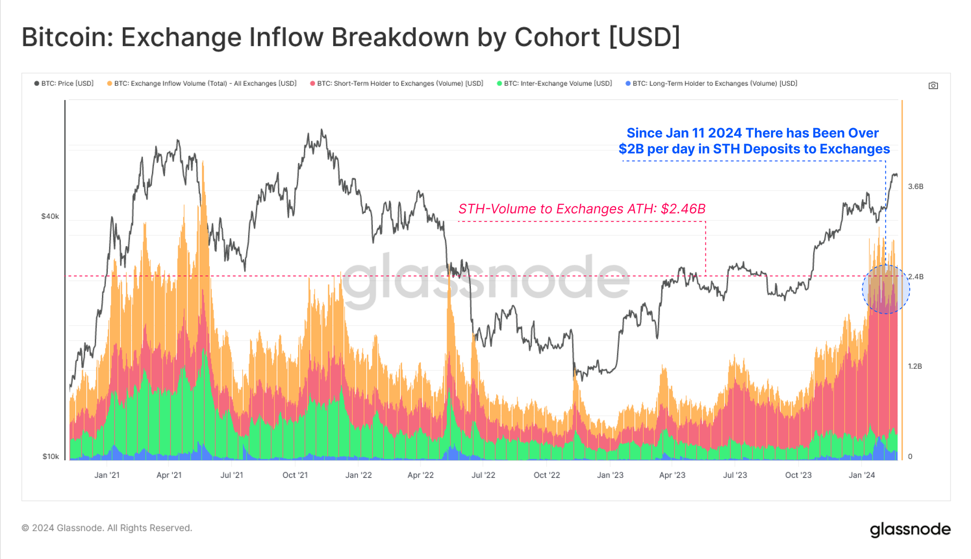Further confluence can be found by evaluating the percentage of the overall STH balance sent to exchanges. Since Oct 2023, the STH cohort have been depositing upwards of 1% of their supply per day, peaking at a value 2.36% during the recent ETF led speculation. This is largest relative deposit since the March 2020 sell-off.