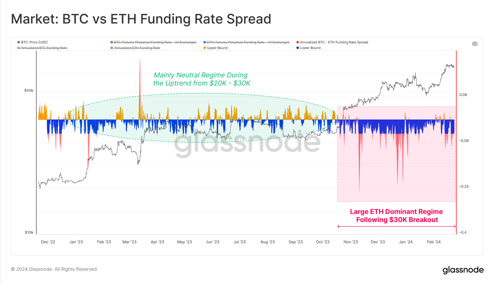 The spread between BTC and ETH funding rates is also is widening. Prior to October-2023, a relatively neutral regime can be observed, where the spread oscillated between positive and negative state.