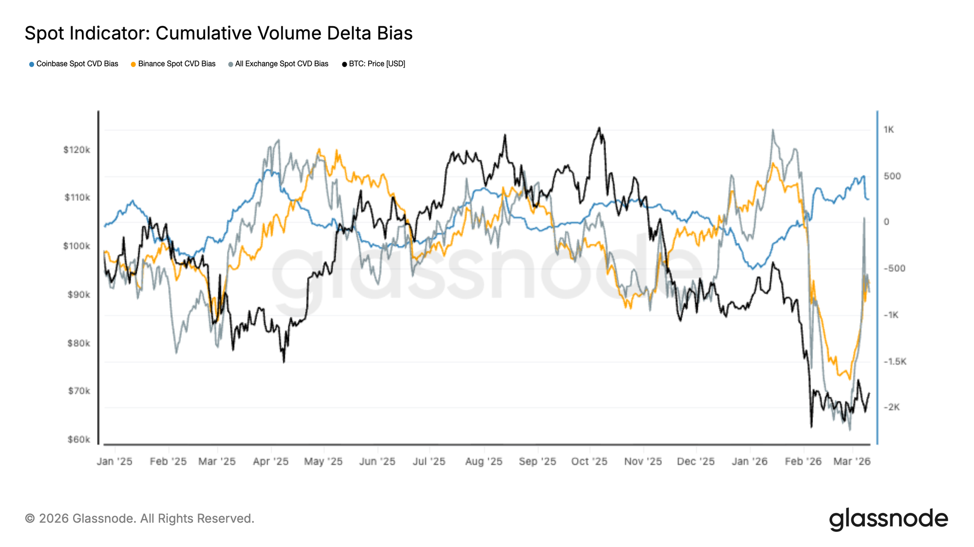 - Spot market demand is showing early signs of recovery, with cumulative volume delta rebounding as buyers begin absorbing sell-side liquidity across major exchanges.