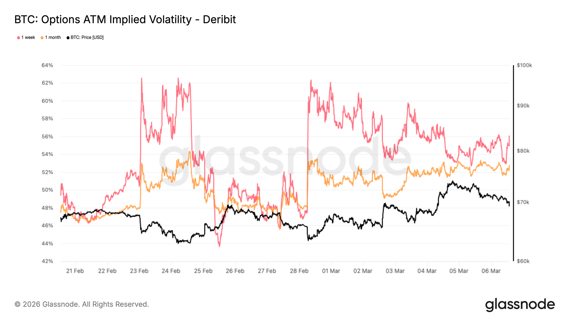 Bitcoin has remained surprisingly resilient following the recent geopolitical shock. That resilience is now reflected in the options market, where short-dated implied volatility has begun to ease.