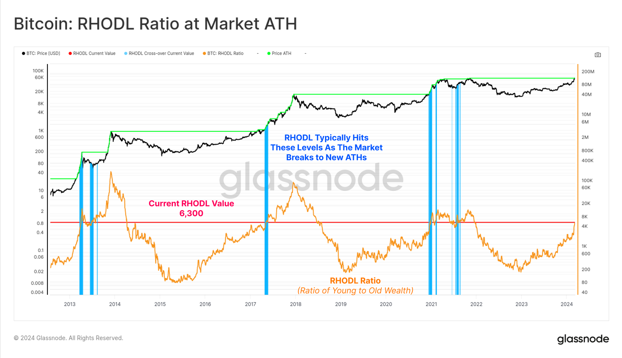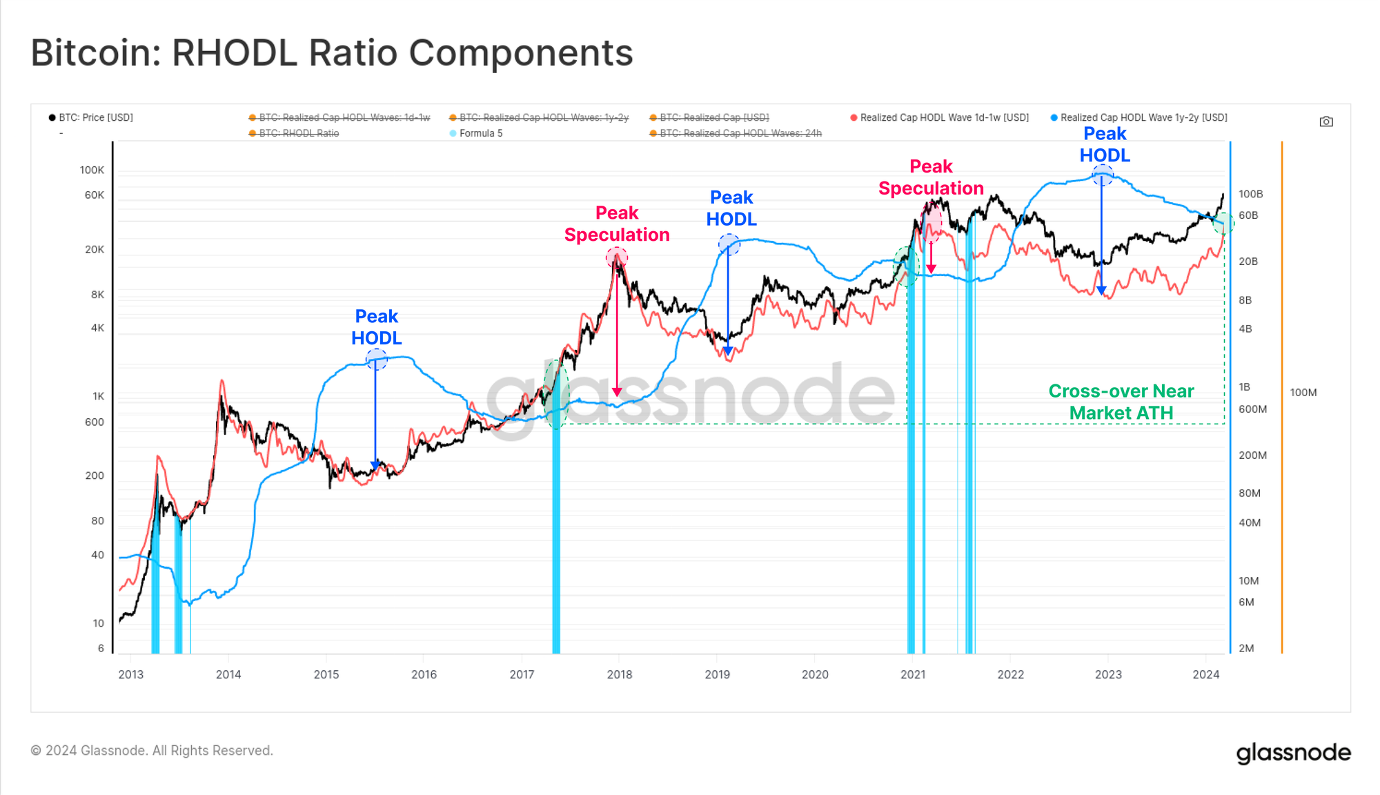 The RHODL Ratio is another popular metric for tracking this transfer of wealth from old HODLers to new investors and Speculators. It is constructed as the ratio between wealth stored within in 1-week old vs 1y-2y old coins.
