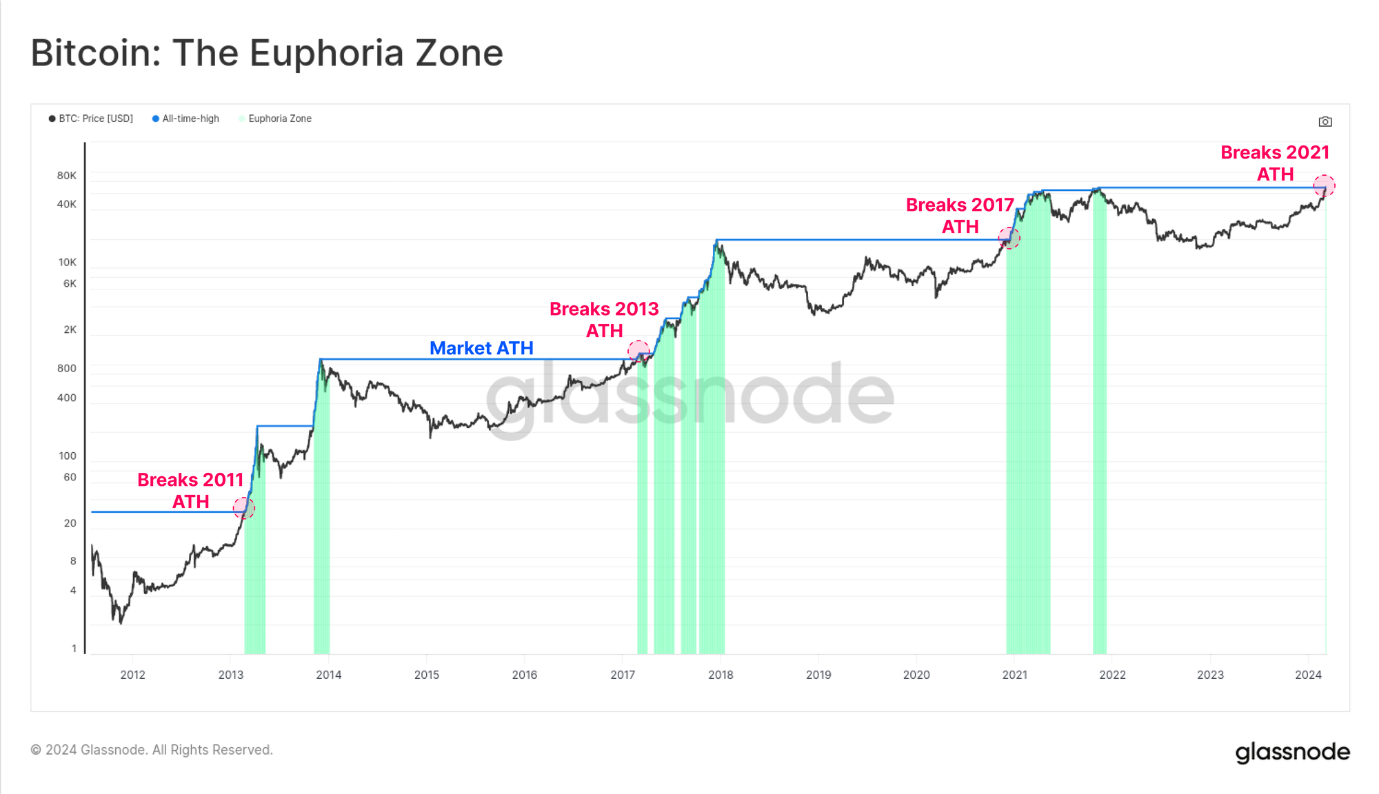 - Bitcoin has broken to a new ATH of $72k relative to the US Dollar, entering price discovery, and pushing investor sentiment closer to Euphoria.