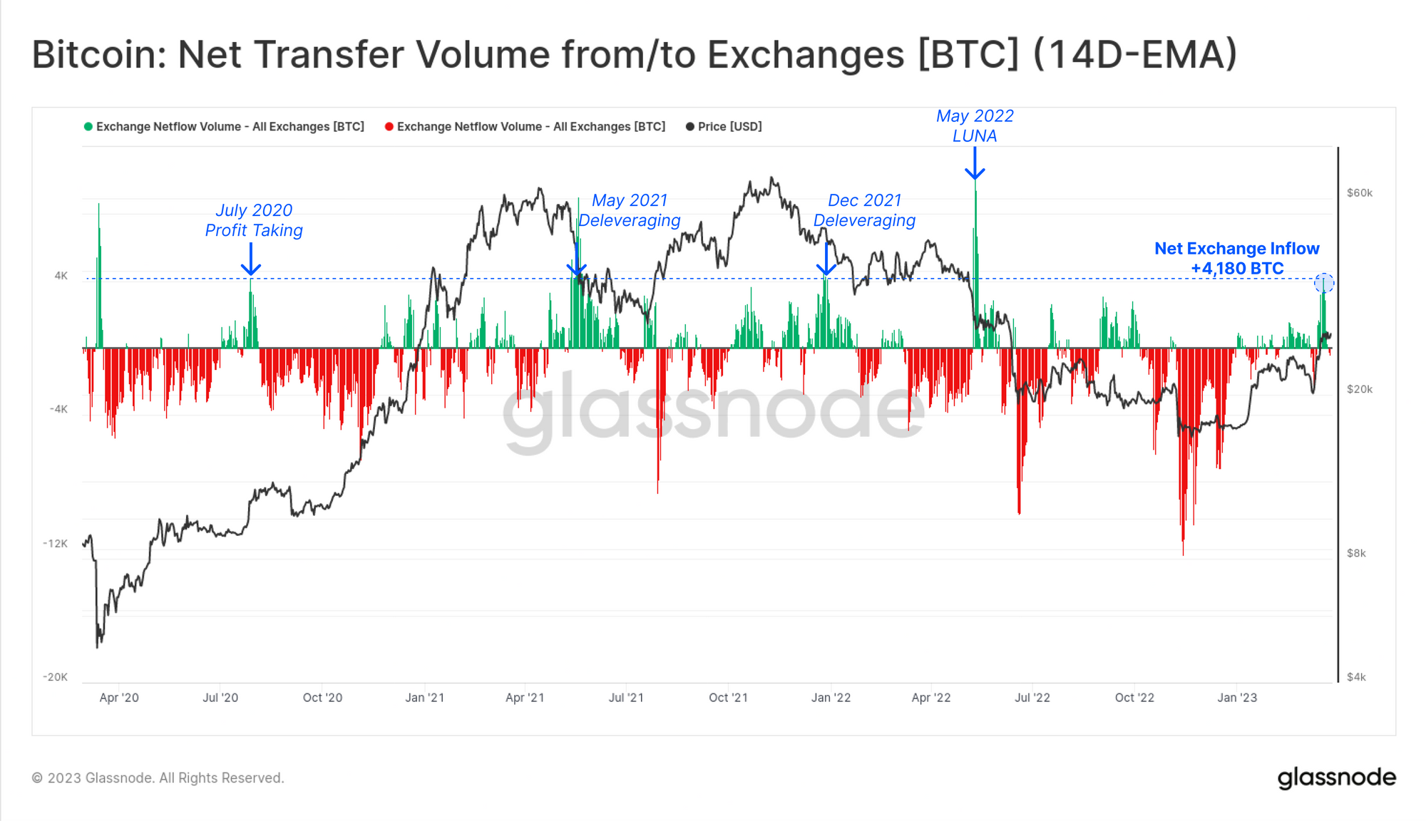In response to the strong price appreciation over recent weeks, investors have increased the volume of coins deposited to exchanges. Net exchange flows ticked higher by approximately 4.18k BTC this week, the largest net increase since LUNA collapsed in May 2022.