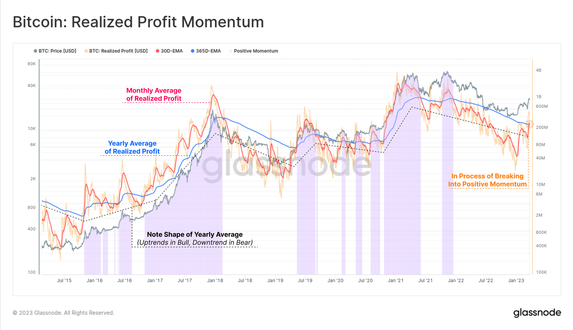 Measuring realized profit/loss is a powerful technique in on-chain analysis, enabled by Pricestamping coins when they move on-chain. From this, we can compare the magnitude of profit locked in over the last month, to the yearly average. Here, we can see that we have the first positive momentum cross-over since the Oct-Nov 2021 ATH.