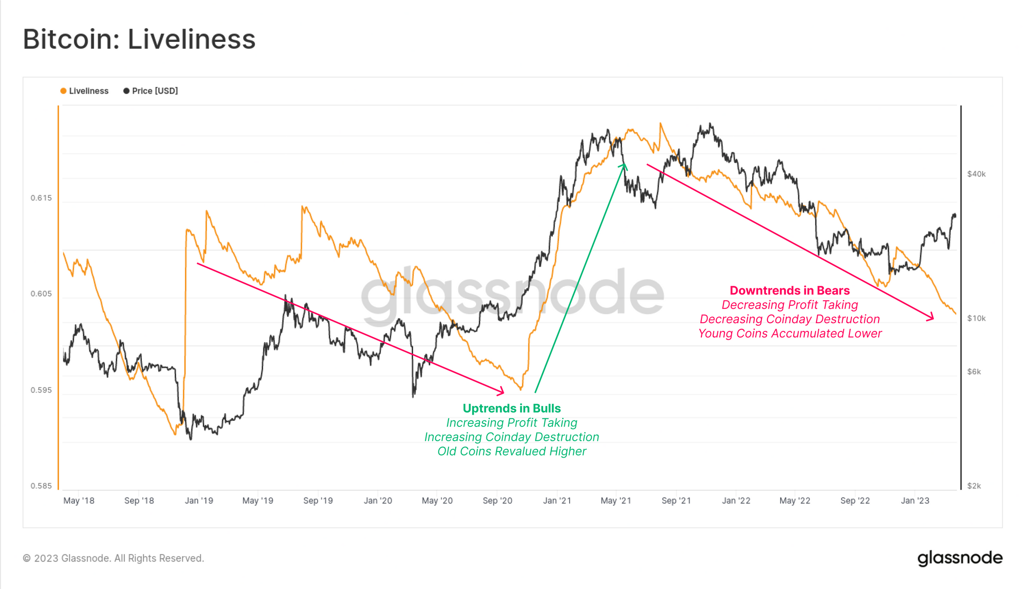 - Liveliness will trend down when the market prefers to accumulate and HODL coins, building a reservoir of Lifespan, and suggesting confidence in the asset.
