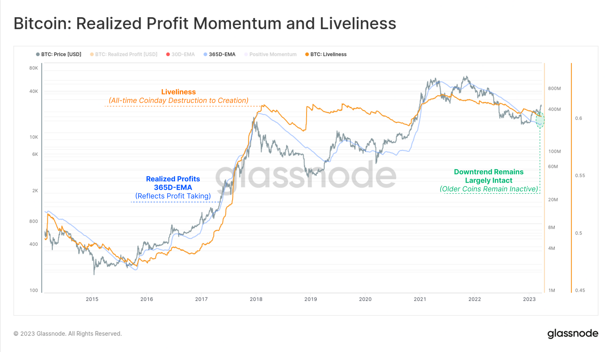Recalling the shape of the Yearly average of Realized Profits, we can see a very similar shape and relationship exists with Liveliness, largely since they describe similar market behaviors:
