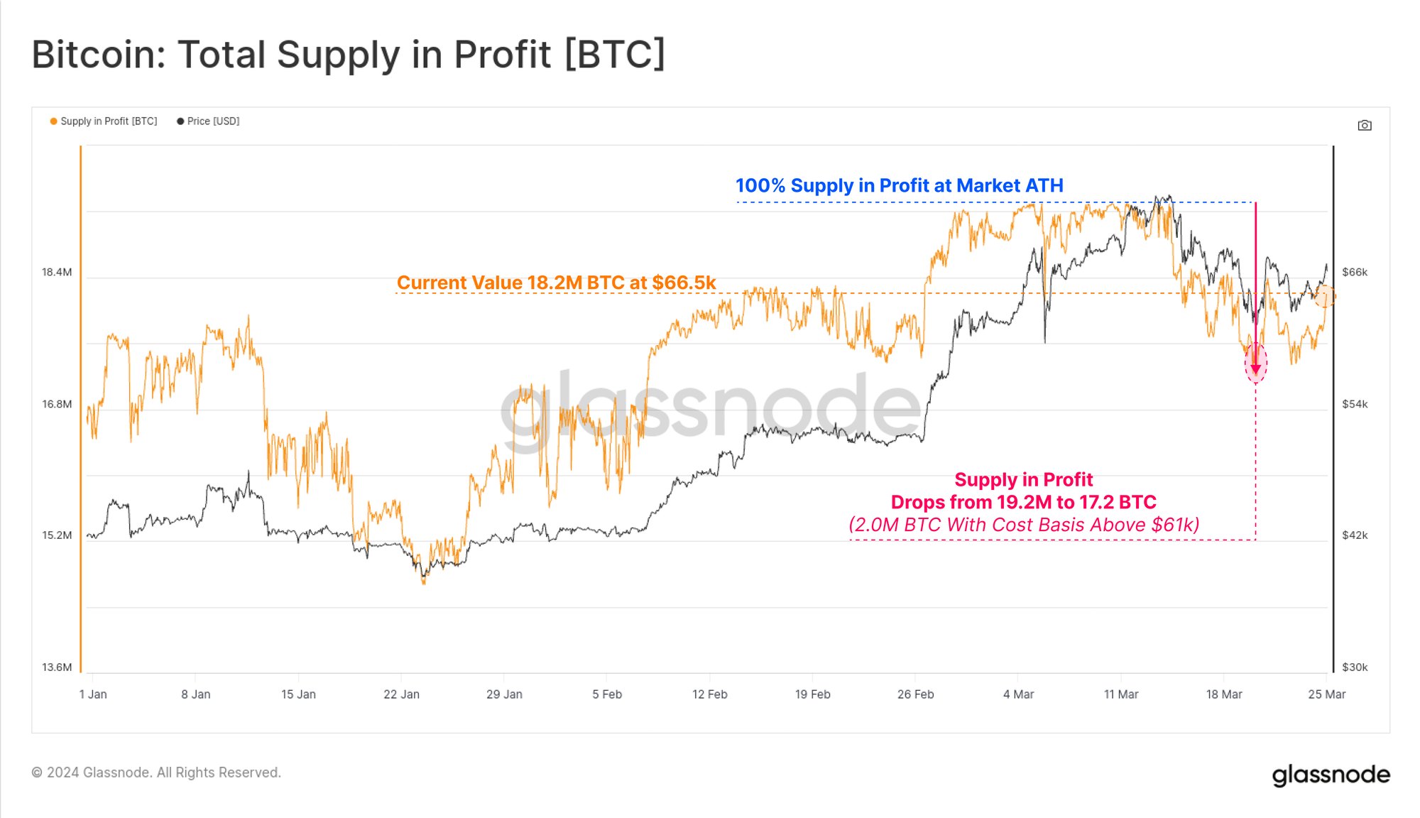 As the market bounced back to $66.5k, around 1.0M coins returned to 'in-profit' status. From these two observations, we can determine that: