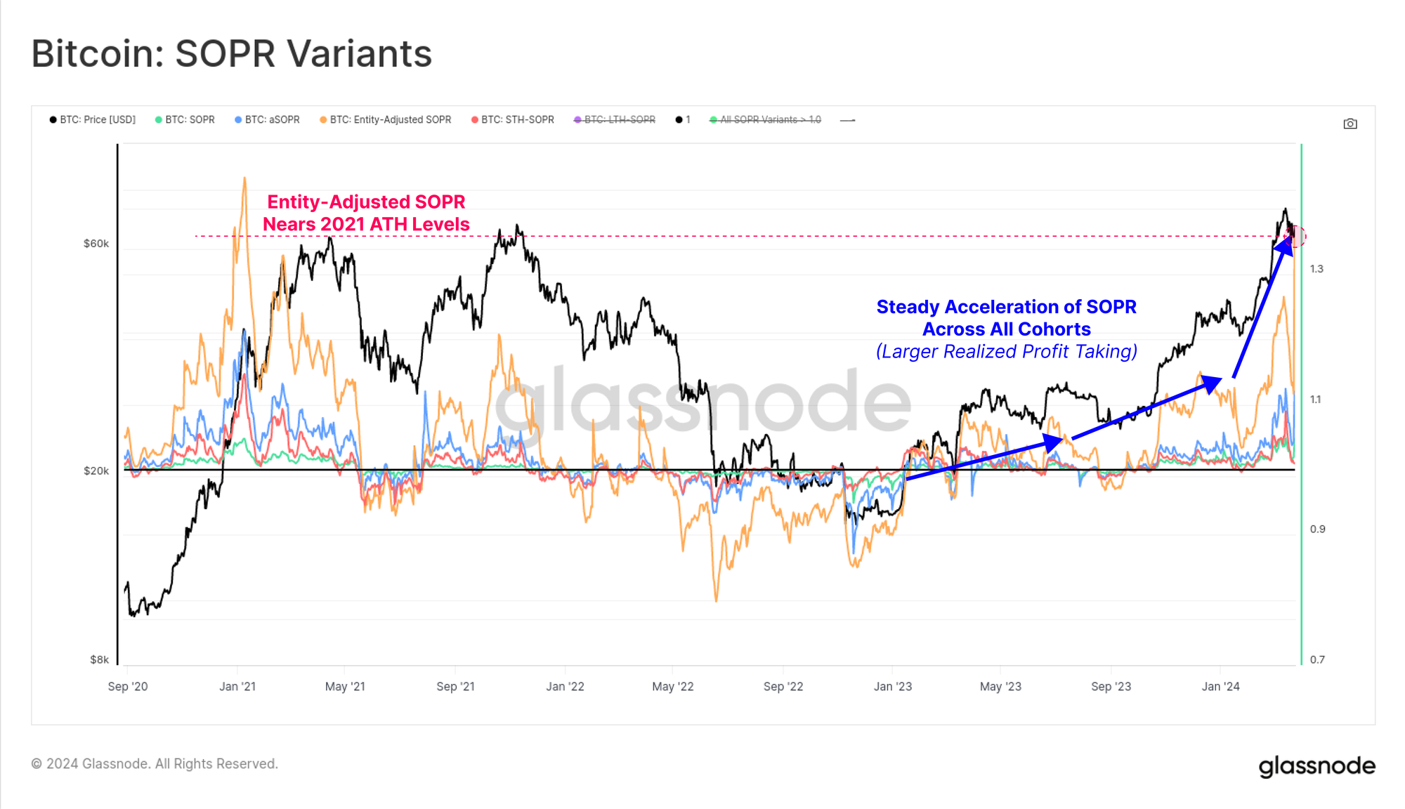 A majority of these 2.0M BTC which now have a cost basis above $61.2k have recently changed hands, with the prior owner spending them to lock in a profit. The chart below presents a suite of variants for the SOPR metric which describes this realized profit behavior.