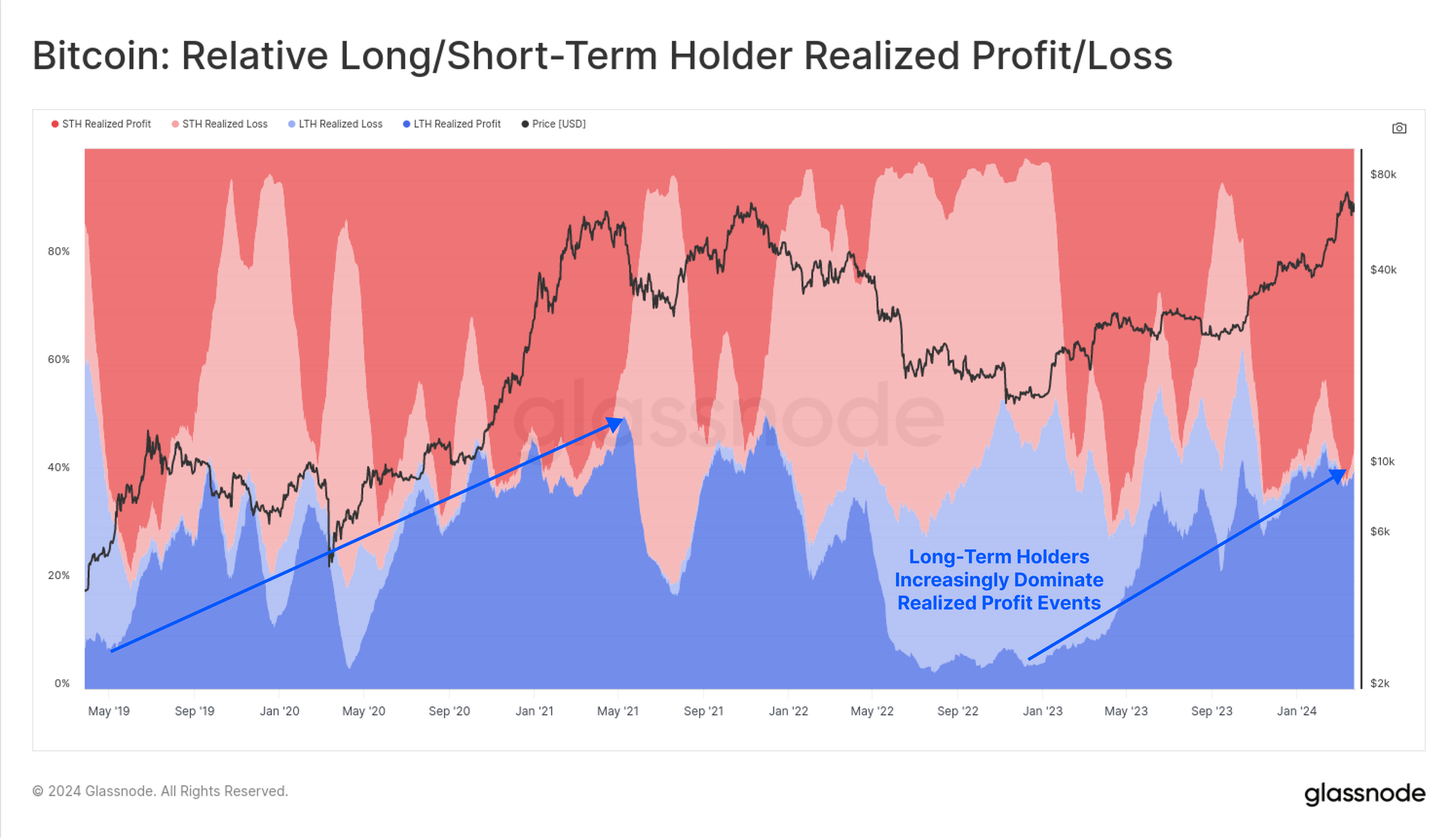 The Bitcoin market has rallied to a new ATH above $73k, triggering an uptick in profit taking events by the Long-Term Holder cohort. The market is currently seeing over $2.6B/day in realized profit, suggesting many investors have started to take chips off the table. This is not atypical market behaviour however, and aligns very closely with market patterns observed during all prior cycle ATH breakouts.