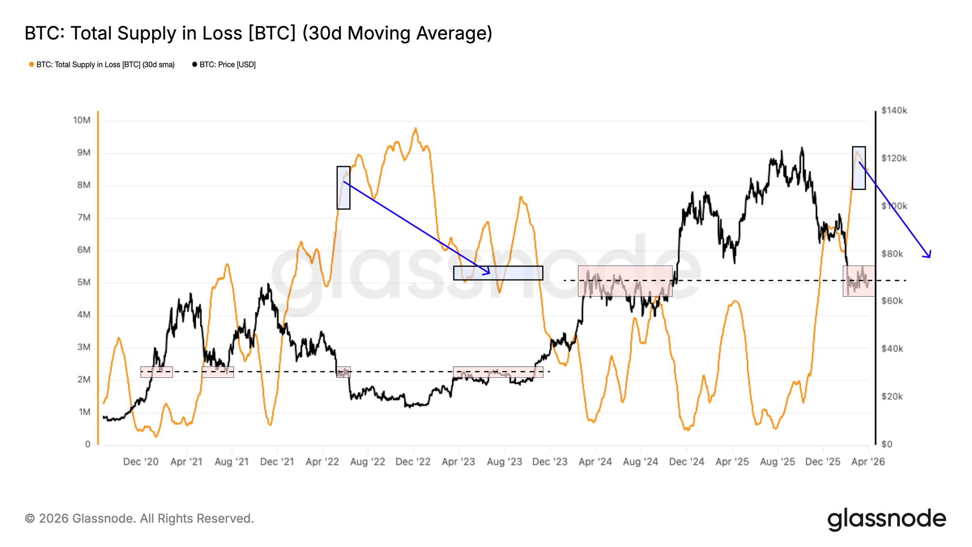 To place the overhead supply overhang in a precise quantitative context, the Total Supply in Loss metric counts the volume of circulating Bitcoin last moved at a price above the current spot level. Applying a 30-day SMA to smooth short-term noise, this indicator currently registers approximately 8.4M BTC, meaning roughly 8M to 9M coins have remained underwater on a sustained basis over the past month.