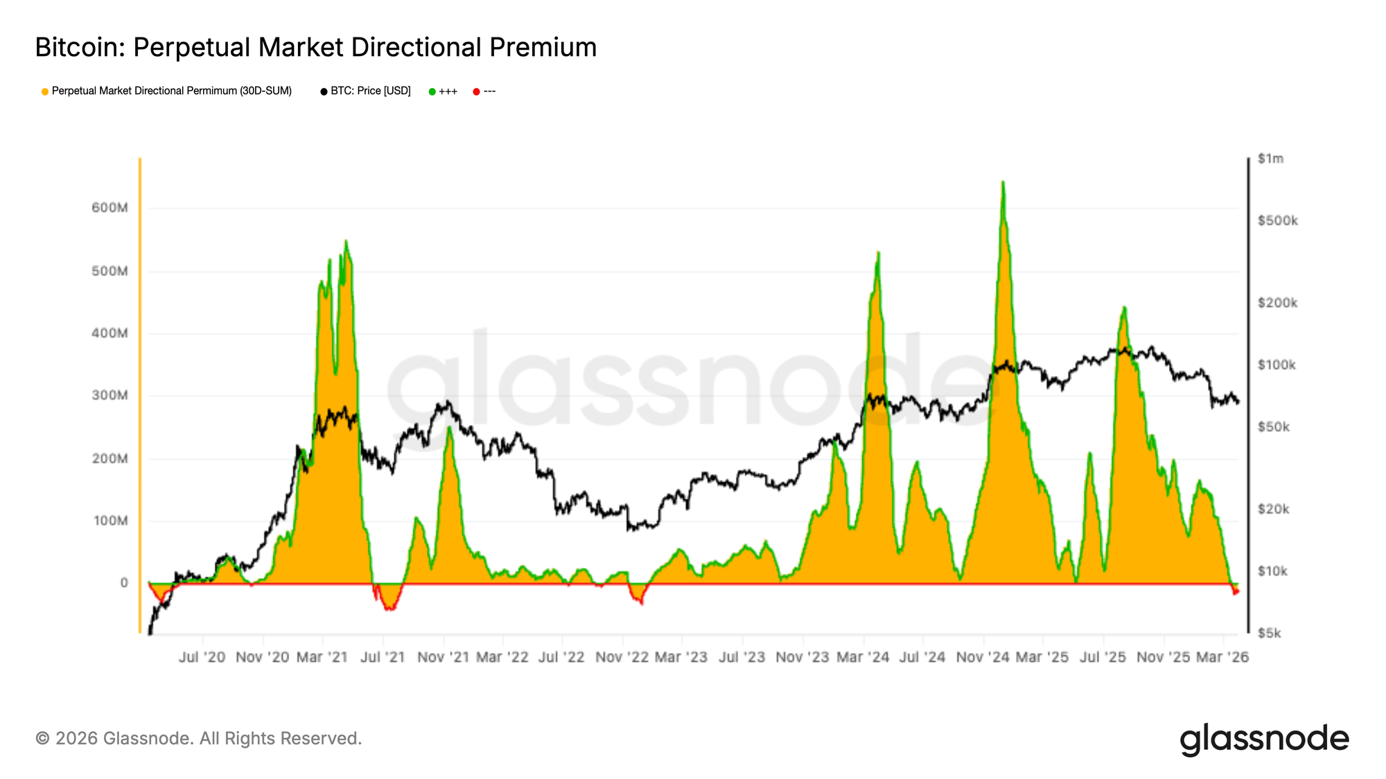 - The Perpetual Market Directional Premium has compressed back toward neutral and slightly below zero, reflecting a reset in long-biased leverage and cooling speculative appetite.