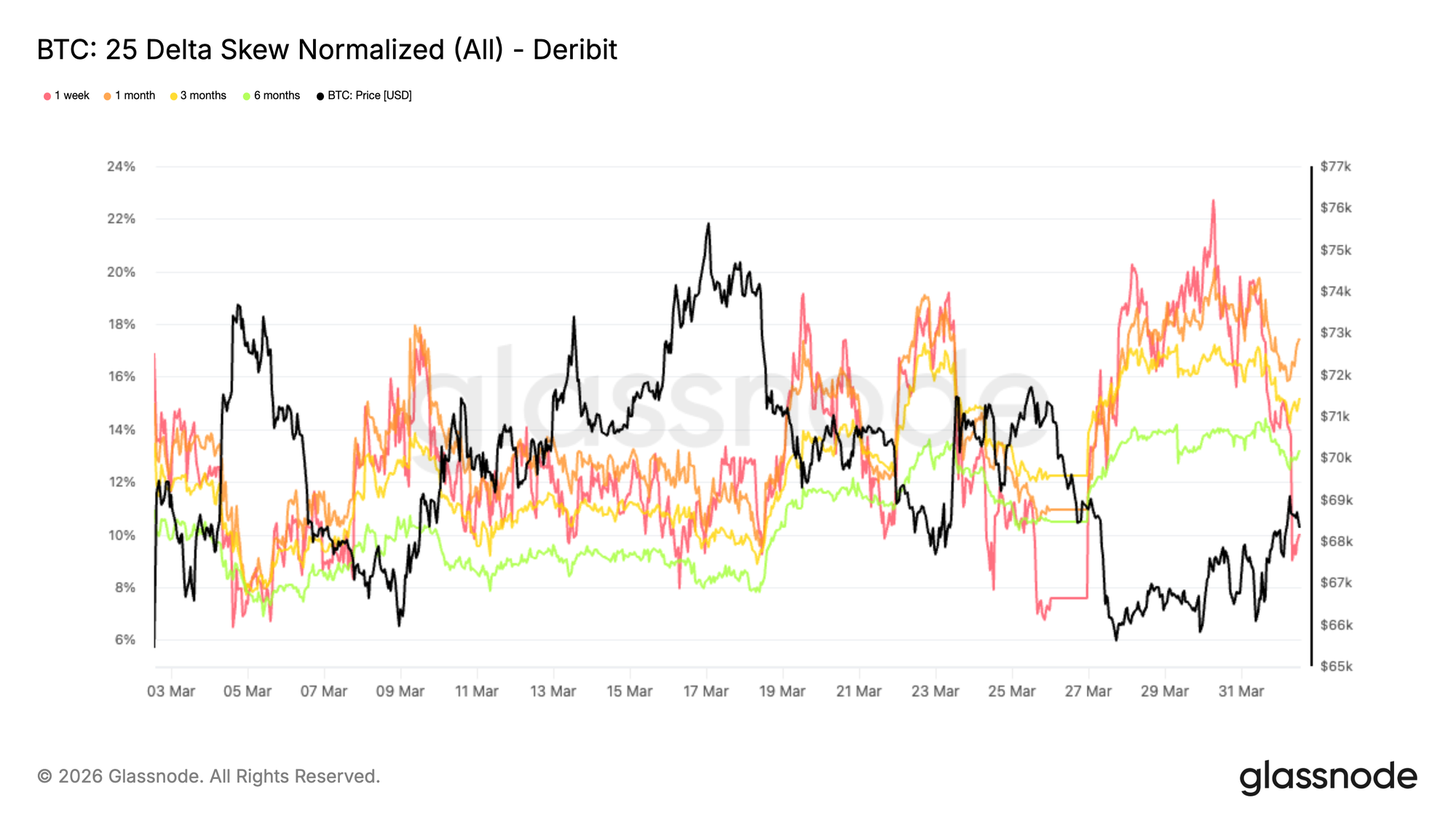 This divergence across tenors is telling. While short term hedging demand has eased slightly with the recent stabilization, medium and longer dated protection remains firmly bid. The market is not aggressively pricing large moves, but it is consistently assigning more weight to downside risks across the curve, pointing to a sustained defensive bias rather than a temporary reaction.