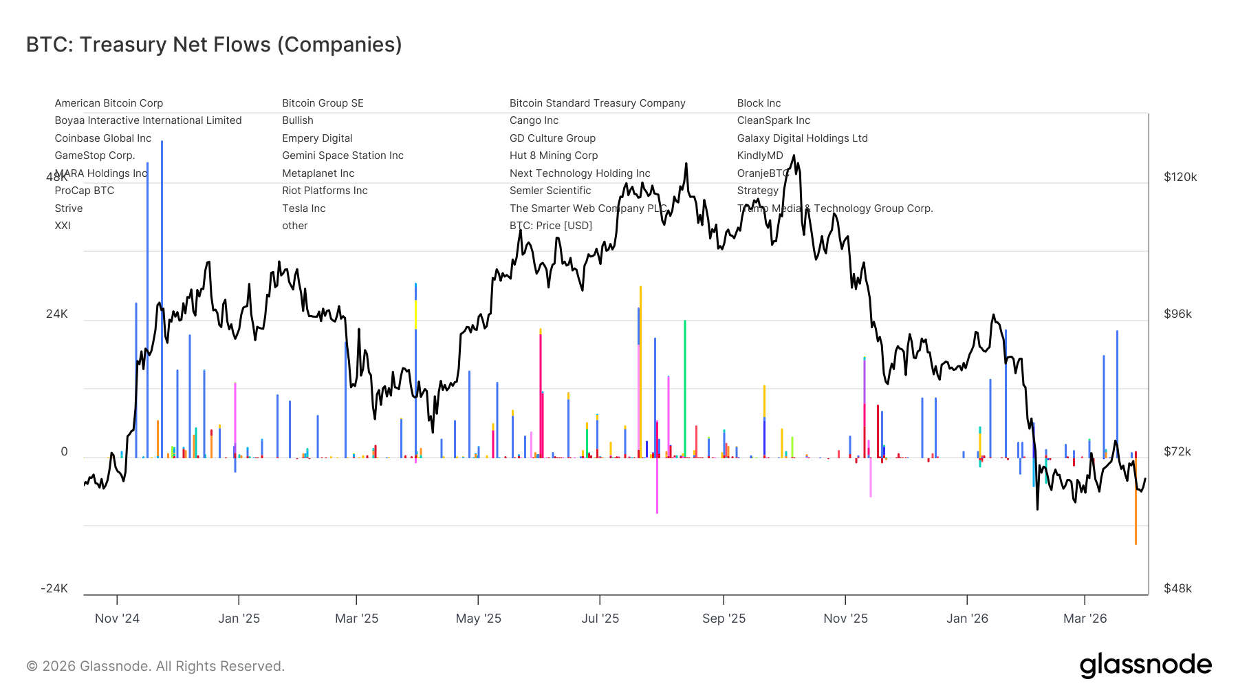 Most notably, Marathon has sold roughly 15k BTC, marking one of the clearest recent examples of a corporate treasury reducing exposure rather than adding to it. Against that, Strategy appears to remain the only consistent structural buyer, continuing to step in with periodic purchases even as participation from other firms has become more sporadic.