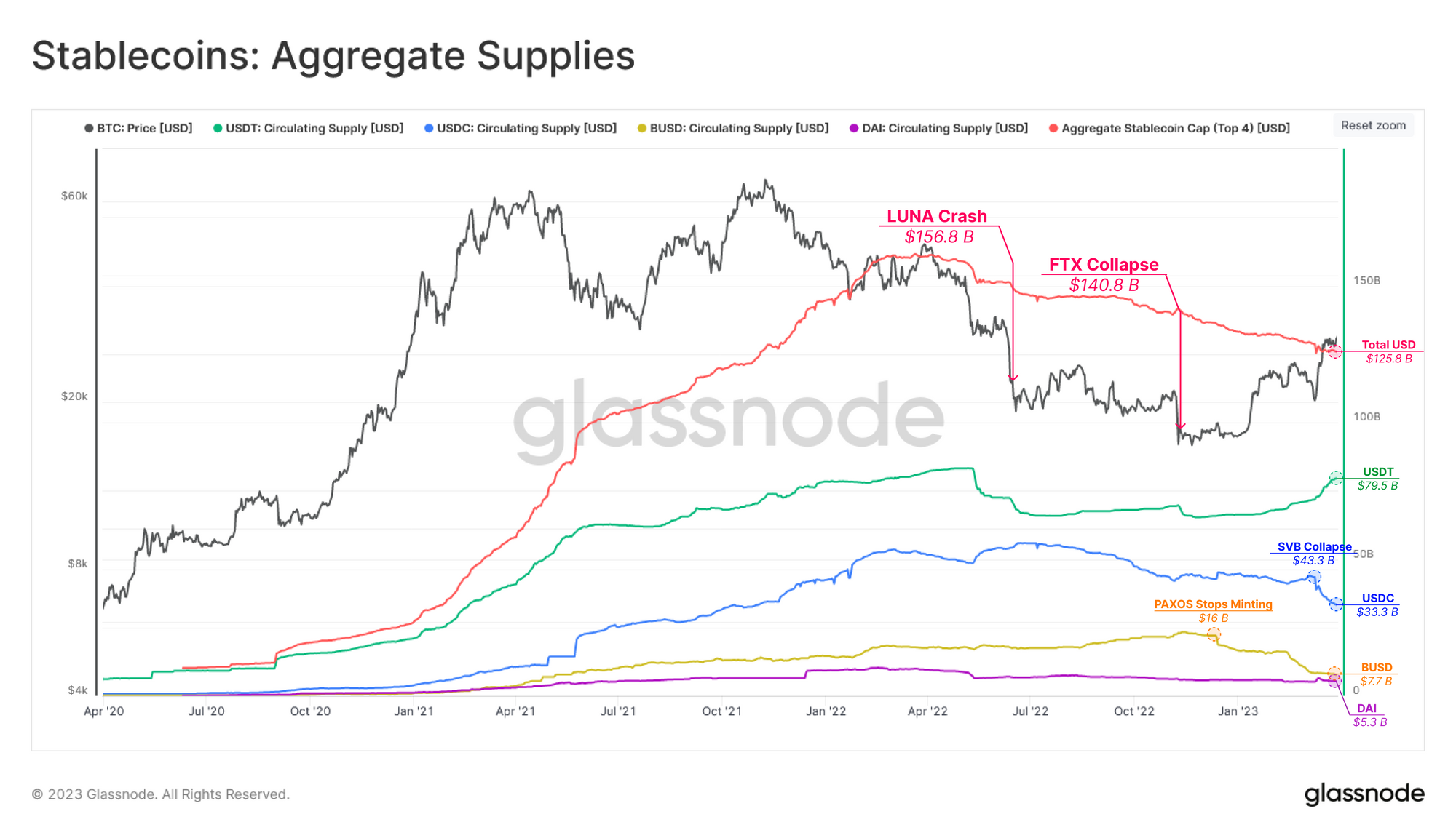 Stablecoins have become an integral component of the digital asset space in recent years, acting as a primary rail through which fiat enters, and exits the market. Looking back at the aggregate market cap trend of the major stablecoins (USDT, USDC, BUSD, and DAI), we can see that it has been in decline for 12 months, reaching $125.8B this week, and a total decline of -22% since the all-time high of $161.56B.