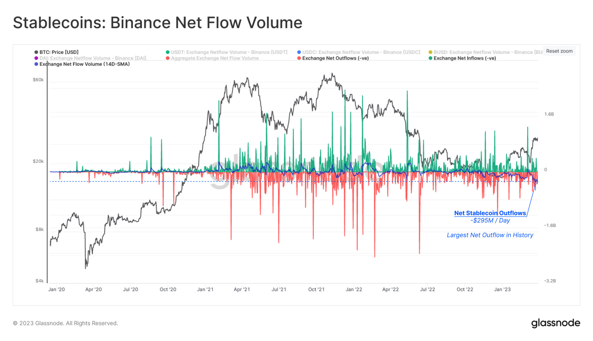 Pressure has been mounting on Binance from US regulators in 2023, with the latest news related to the exchange, and its CEO facing a CFTC lawsuit due to alleged regulatory violations. Given the degree of uncertainty related to bank and exchange solvency of late, we can assess the net flow of funds in and out of Binance to gauge market sentiment.