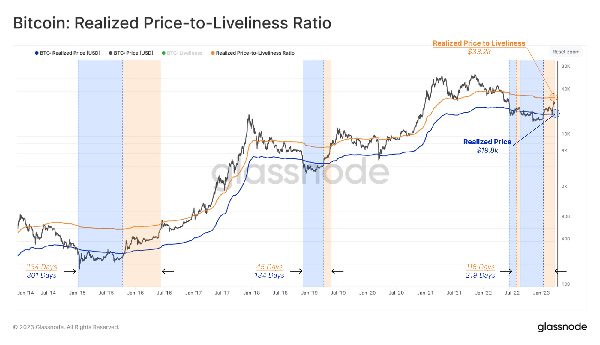 - The upper bound by the Realized Price-to-Liveliness Ratio 🟠 ($33.2k), a variant of the Realized Price that accounts for the relative degree of coin activity on-chain.