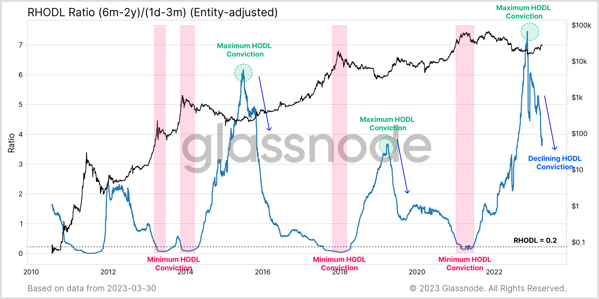 The current structure of the RHODL ratio suggests a notably abrupt rotation of capital starting as FTX collapsed, with coins transferring from long-term holders, towards a new cohort of buyers. This sharp decline in the RHODL Ratio can be seen in prior cycles to be an inflection point, suggesting a changing of the tides.