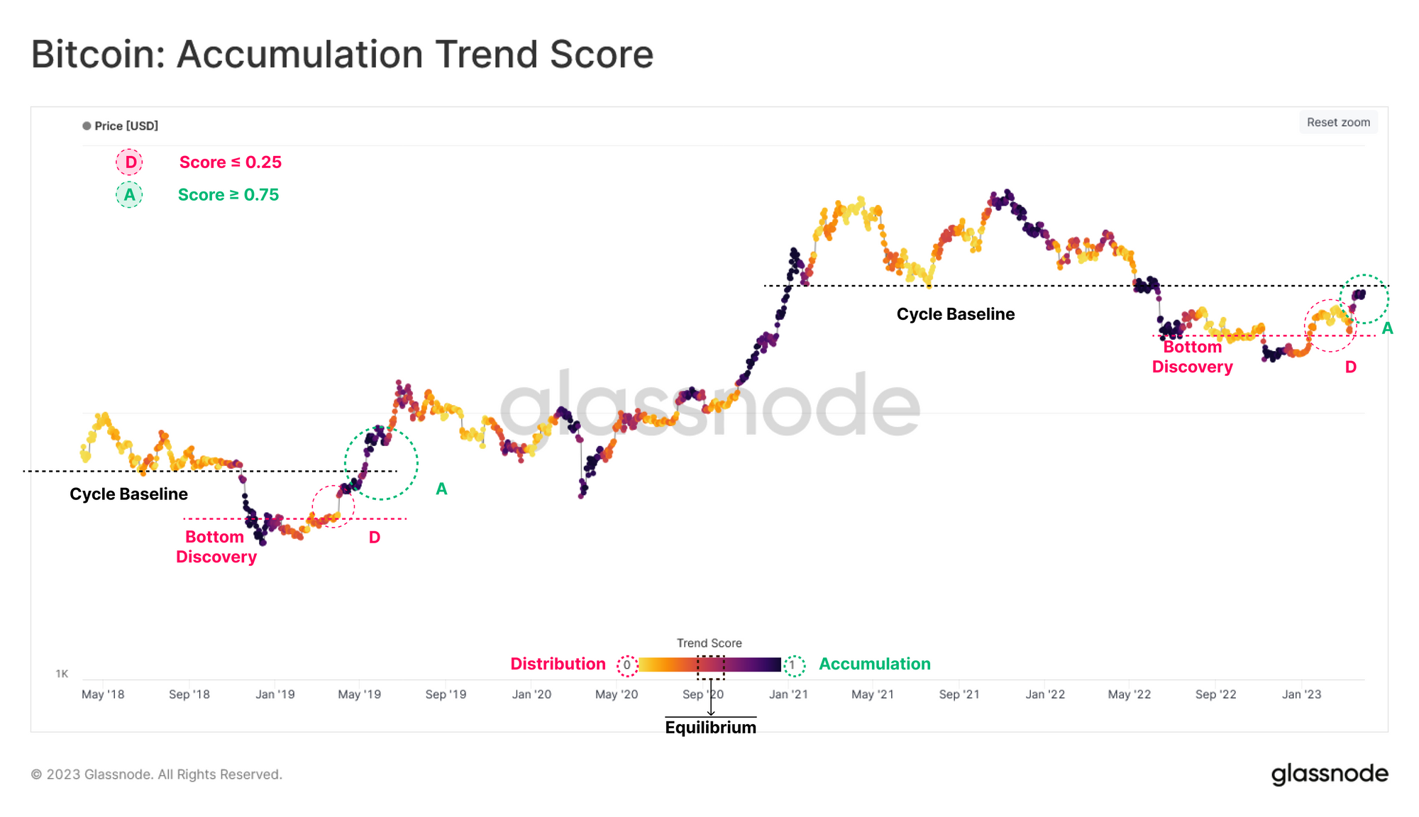 The Accumulation Trend Score reflects the aggregated balance change of on-chain wallets over the past 30 days, with a higher weight assigned to larger entities (such as whales and institutional-sized wallets). Historically, The early stages of market recoveries tend to trigger a degree of distribution 🔴, returning trend scores below 0.25.