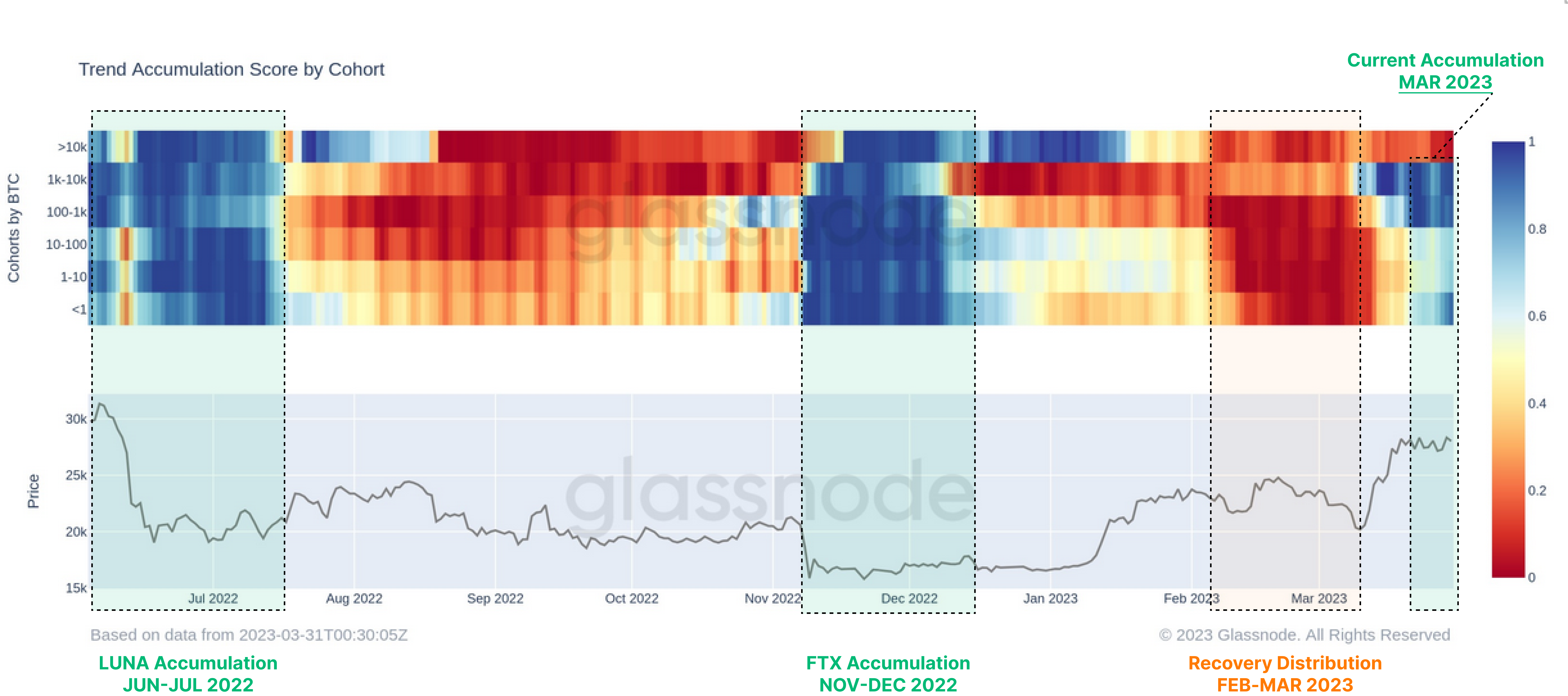 We can further inspect the components of the Accumulation Trend Score to provide a more granular analysis of various wallet balance cohorts. Here we can see that behavior across many wallet cohorts shifted towards balance increase in mid-March, with the only exception being whale entities holding >10k BTC.