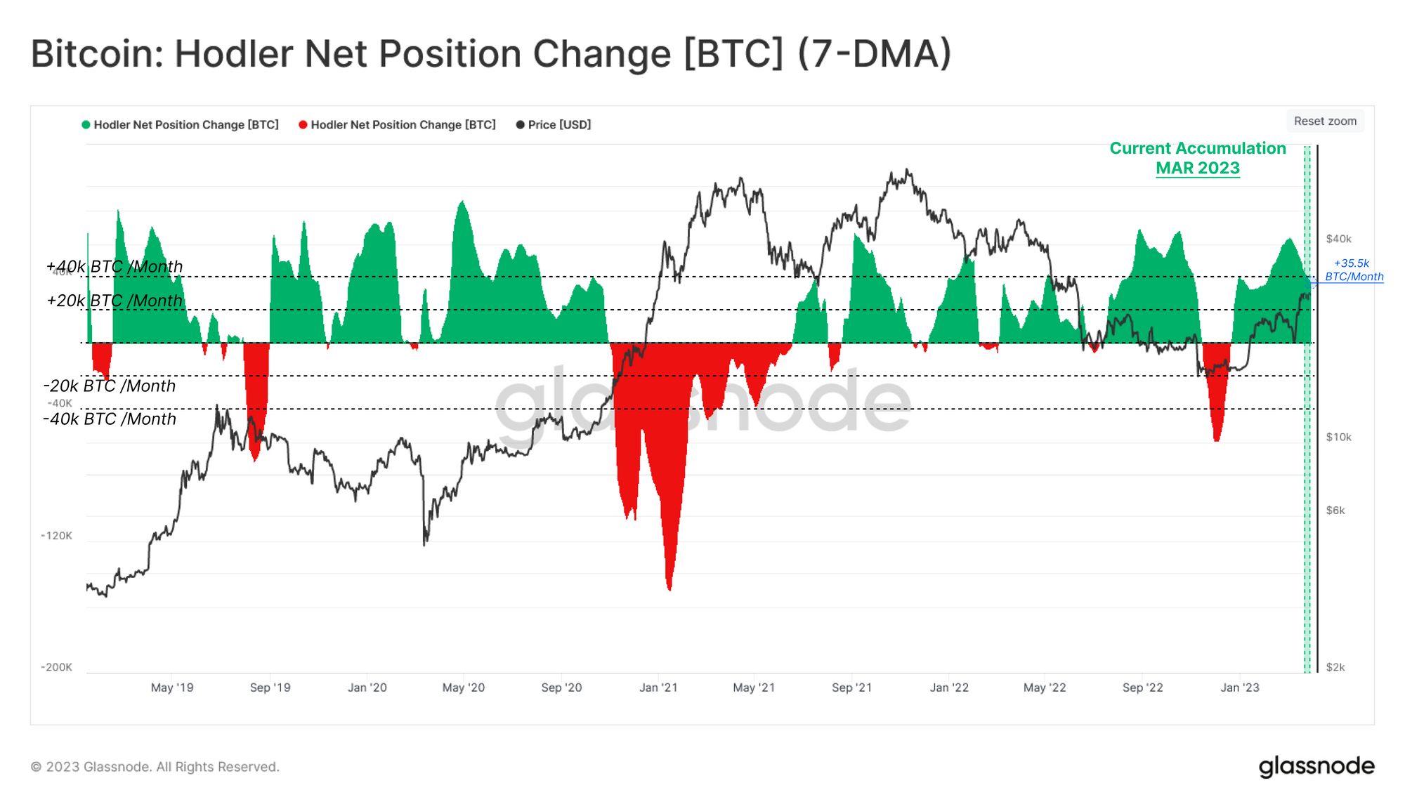 In addition to wallet cohorts, the behavior of market participants can be evaluated from the HODLer perspective, measuring supply change based on holding times. The HODLer Net Position Change presents the rolling 30-day change in coins ageing in wallets: