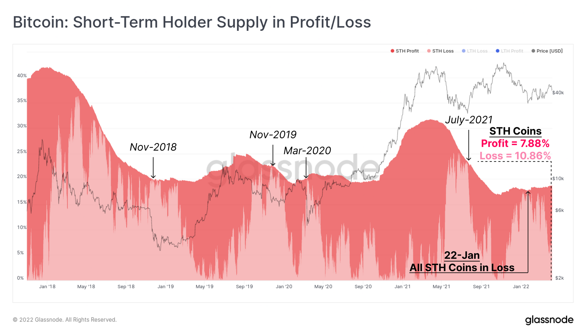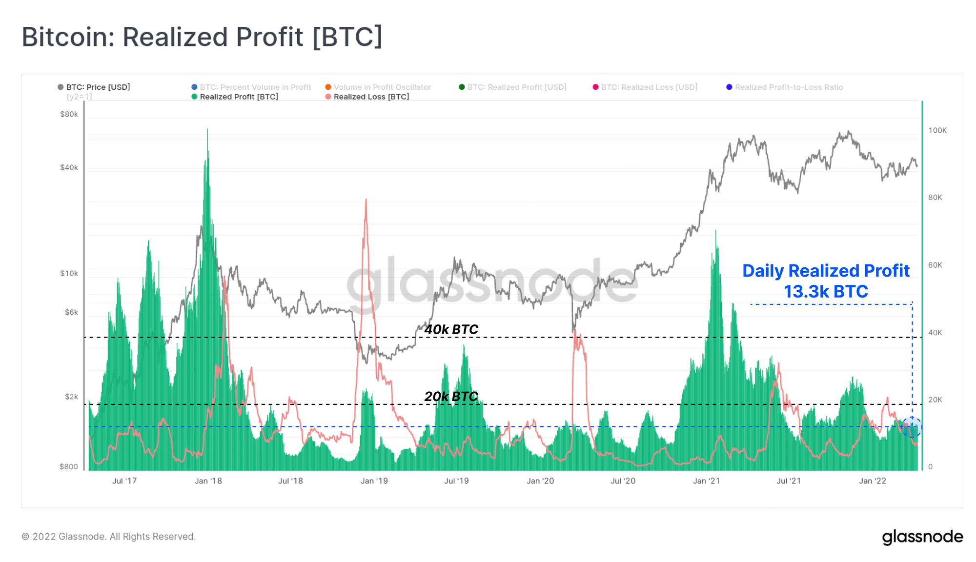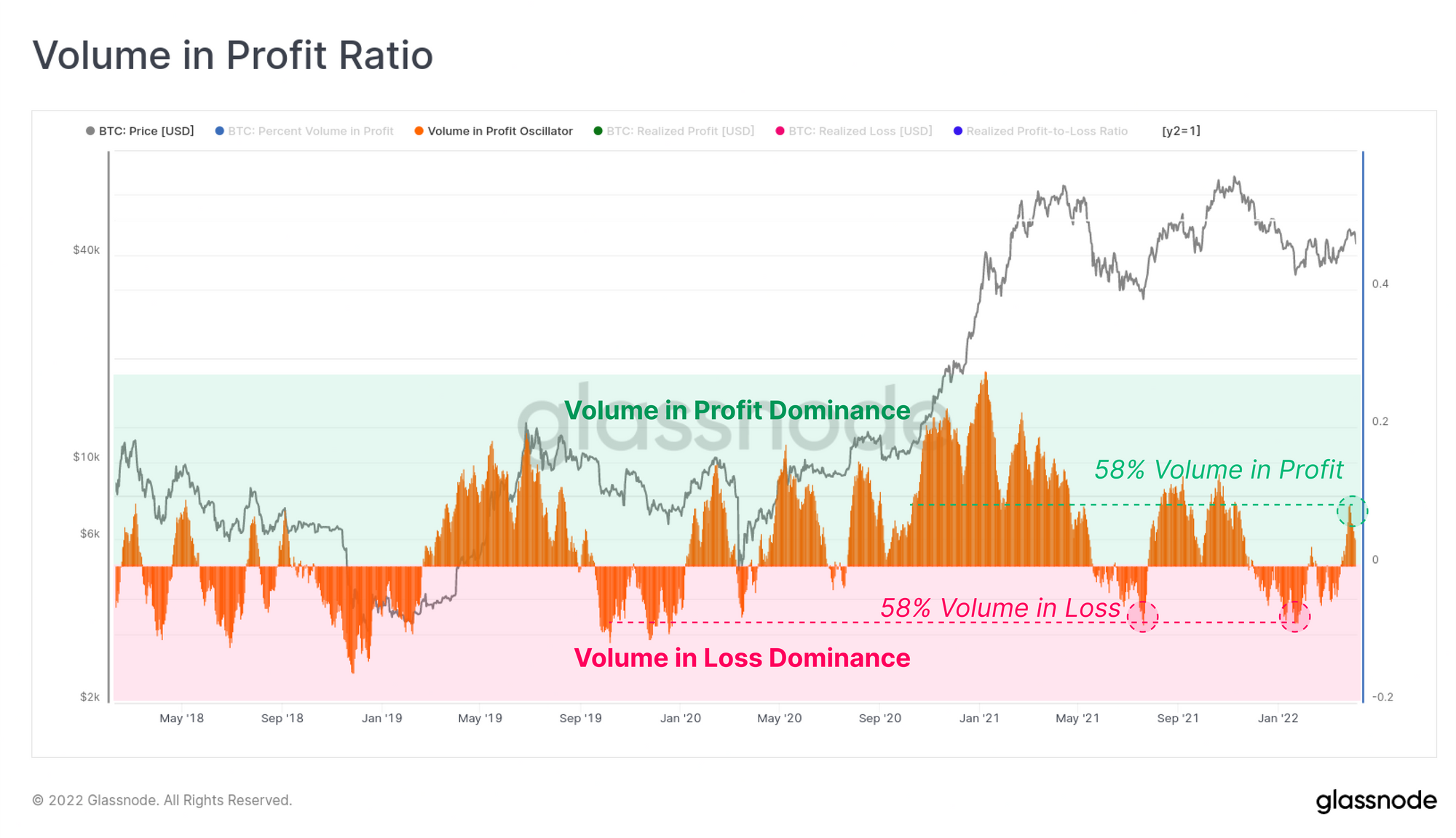 - Investor spending behaviour appears to be switching from dominance of loss realization, towards a modest amount of profit taking. 58% of transaction volume is currently realizing a profit.